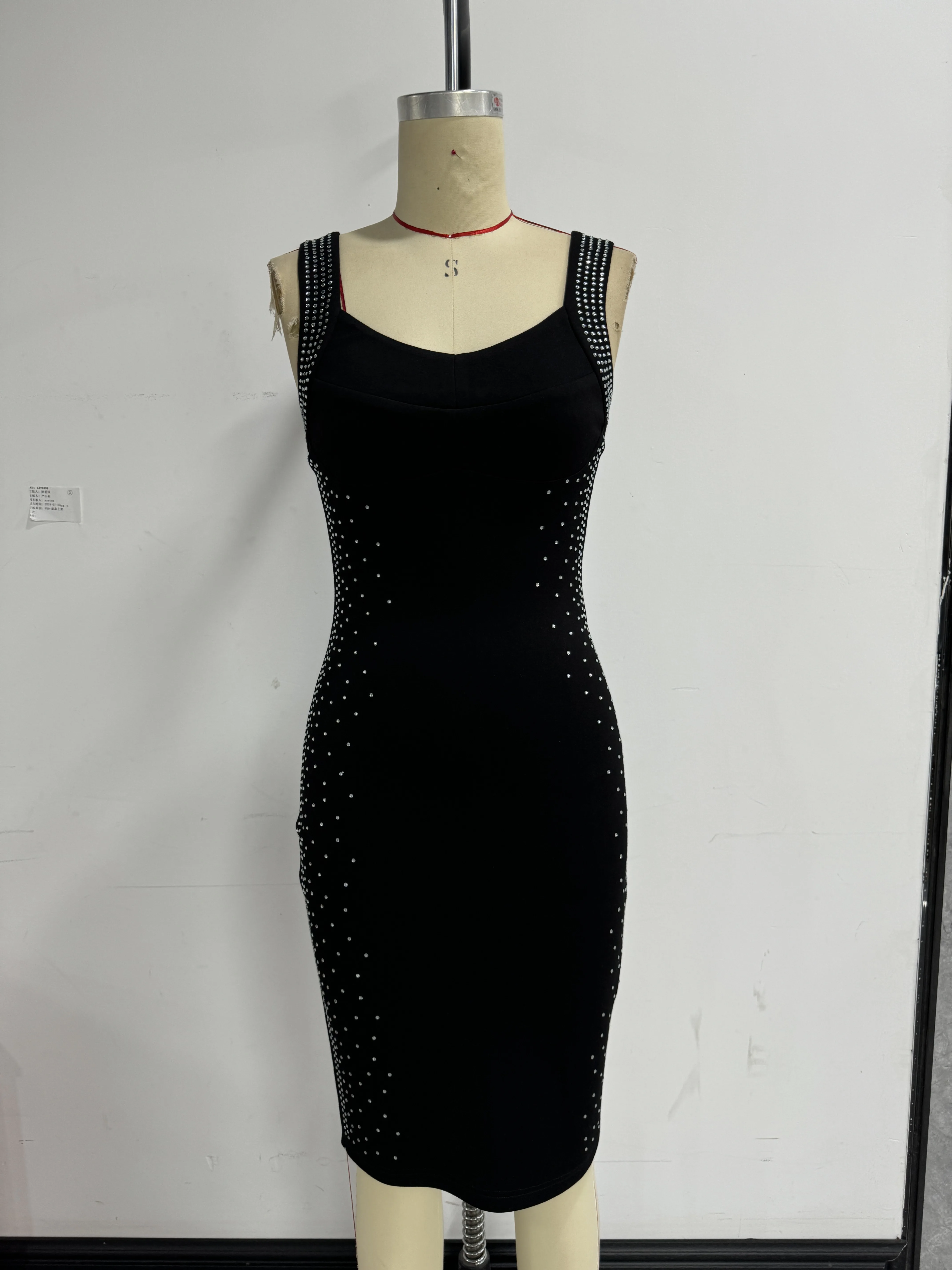 Fleepmart V-Neck Sleeveless Rhinestone Decor Slim Fit Bodycon Party Dress
