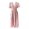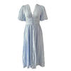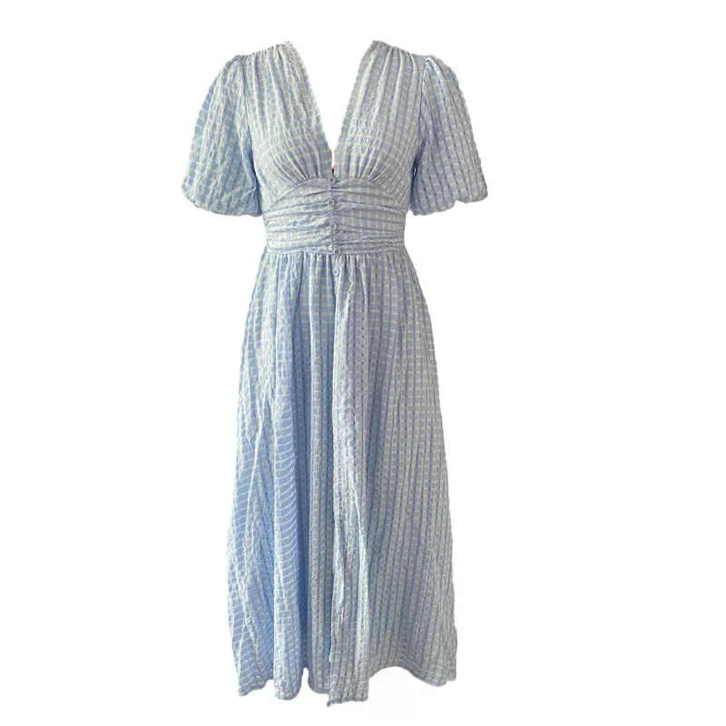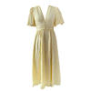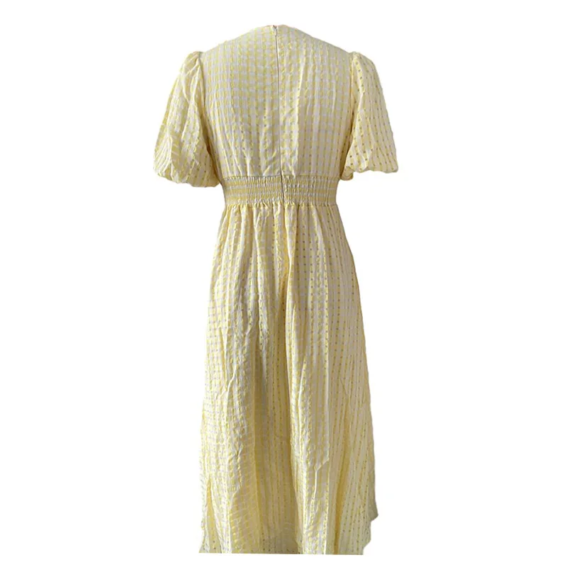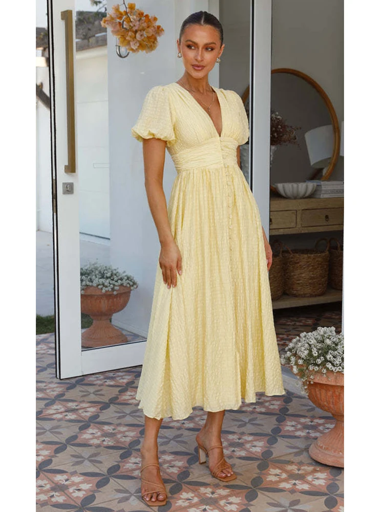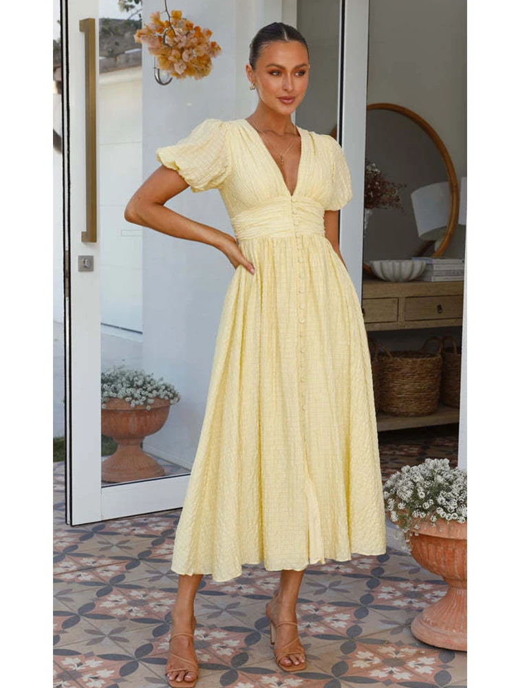 Fleepmart V-neck Yellow Puff Sleeve Split Solid Summer Women Dress 2024 A-line Maxi Long Sundress Vestido Button Beach Dress Party