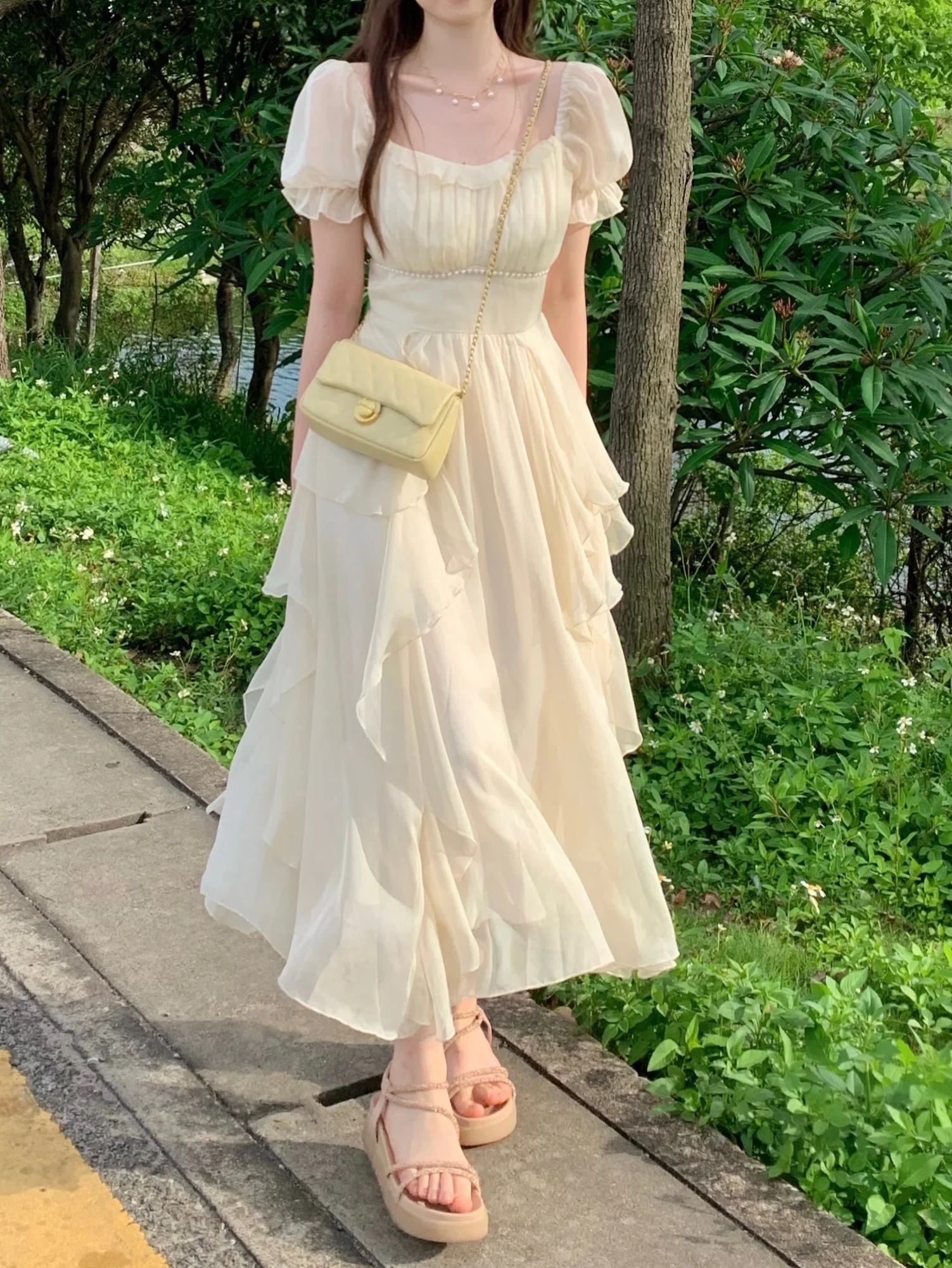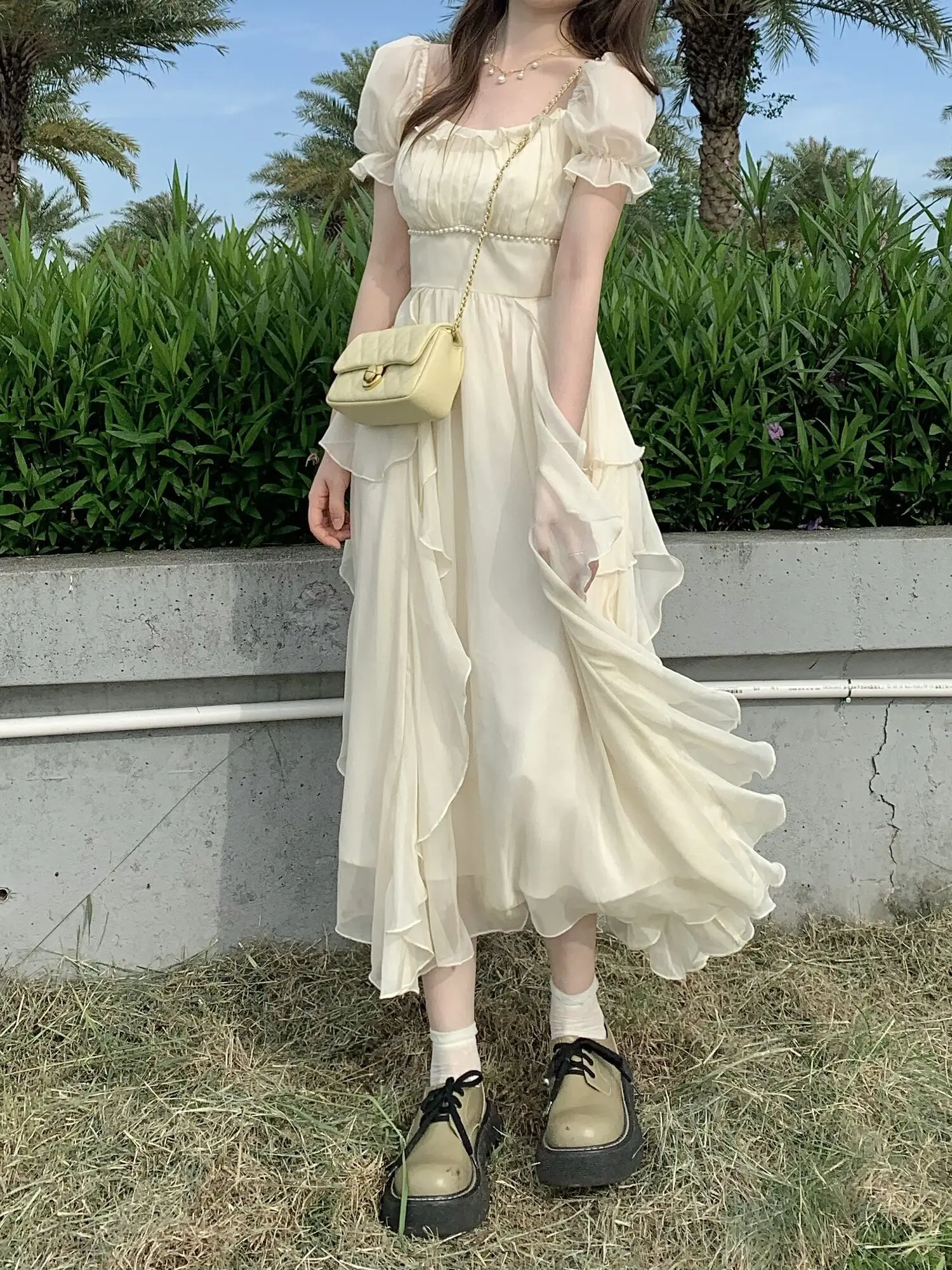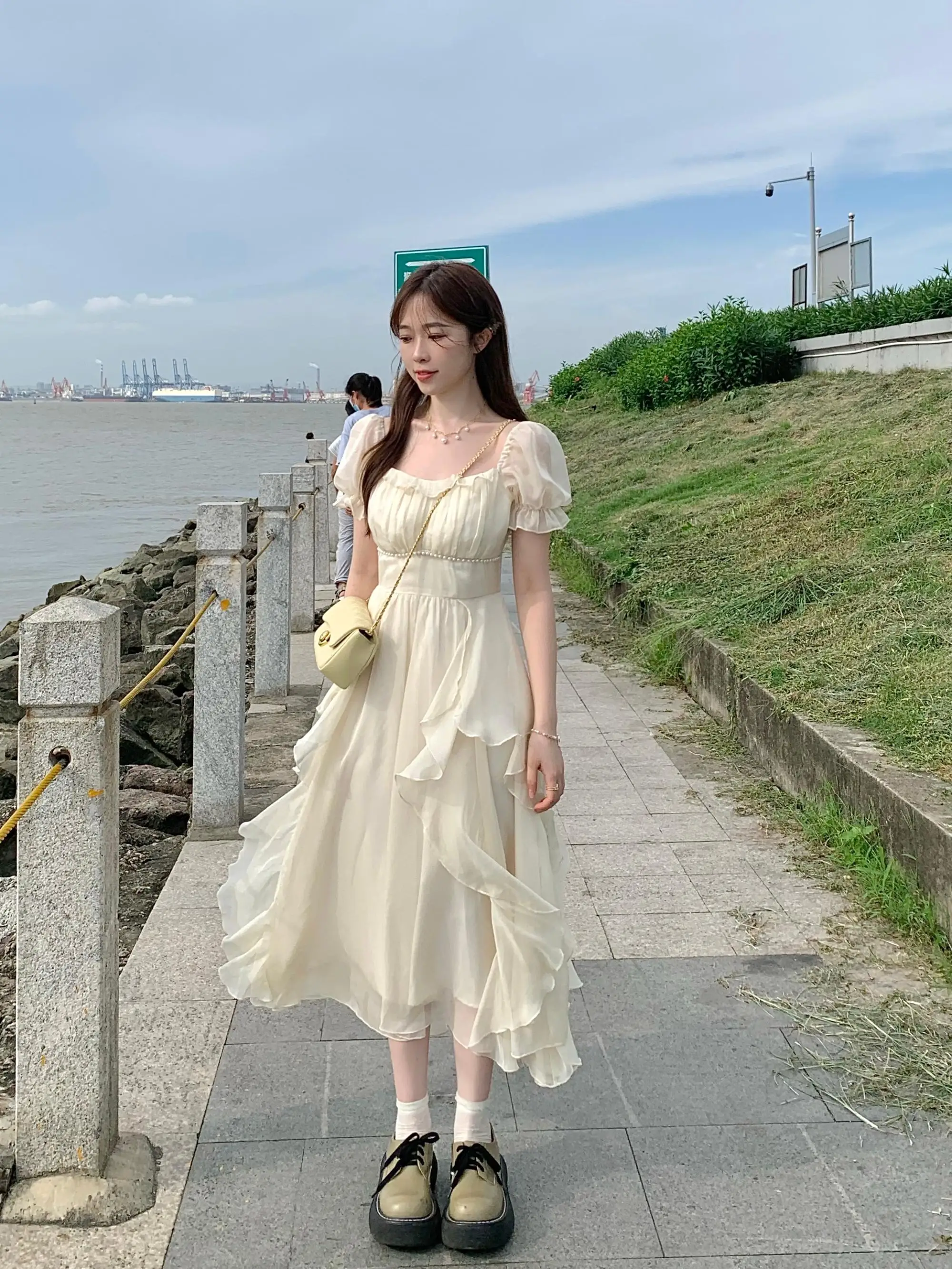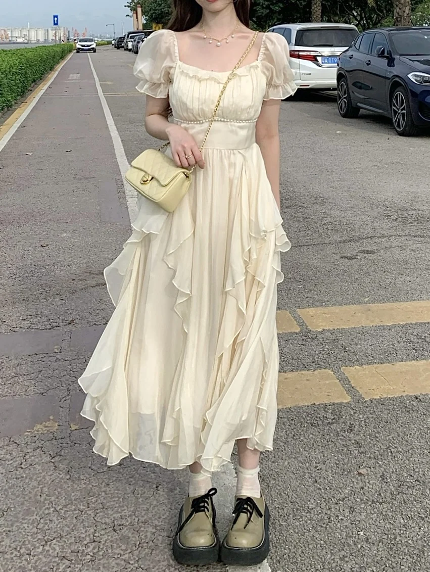 Fleepmart Vintage French Sweet Fairy Lace Beading Chiffon Dress Evening Midi Dresses For Women Elegant Party Casual Beach Summer