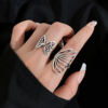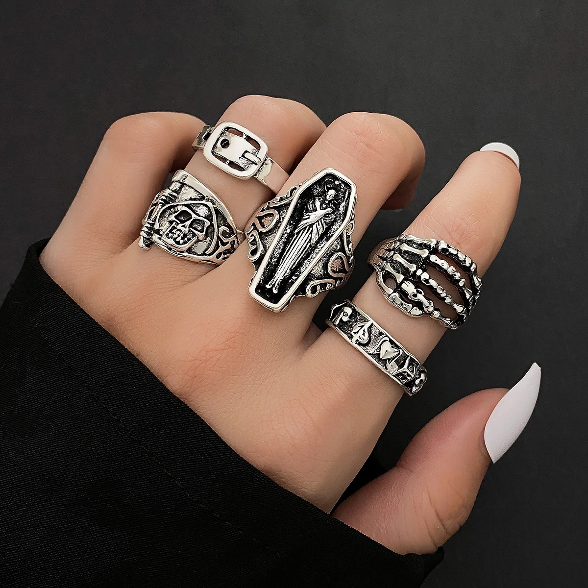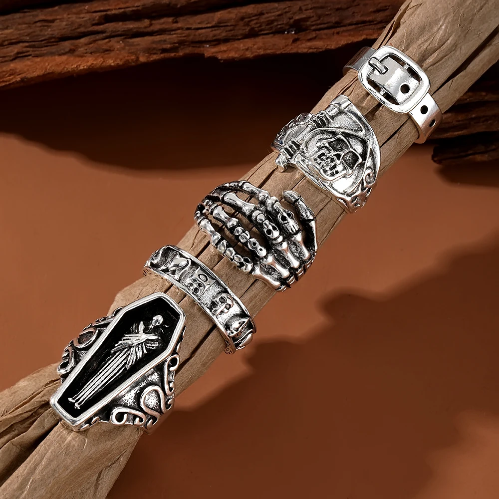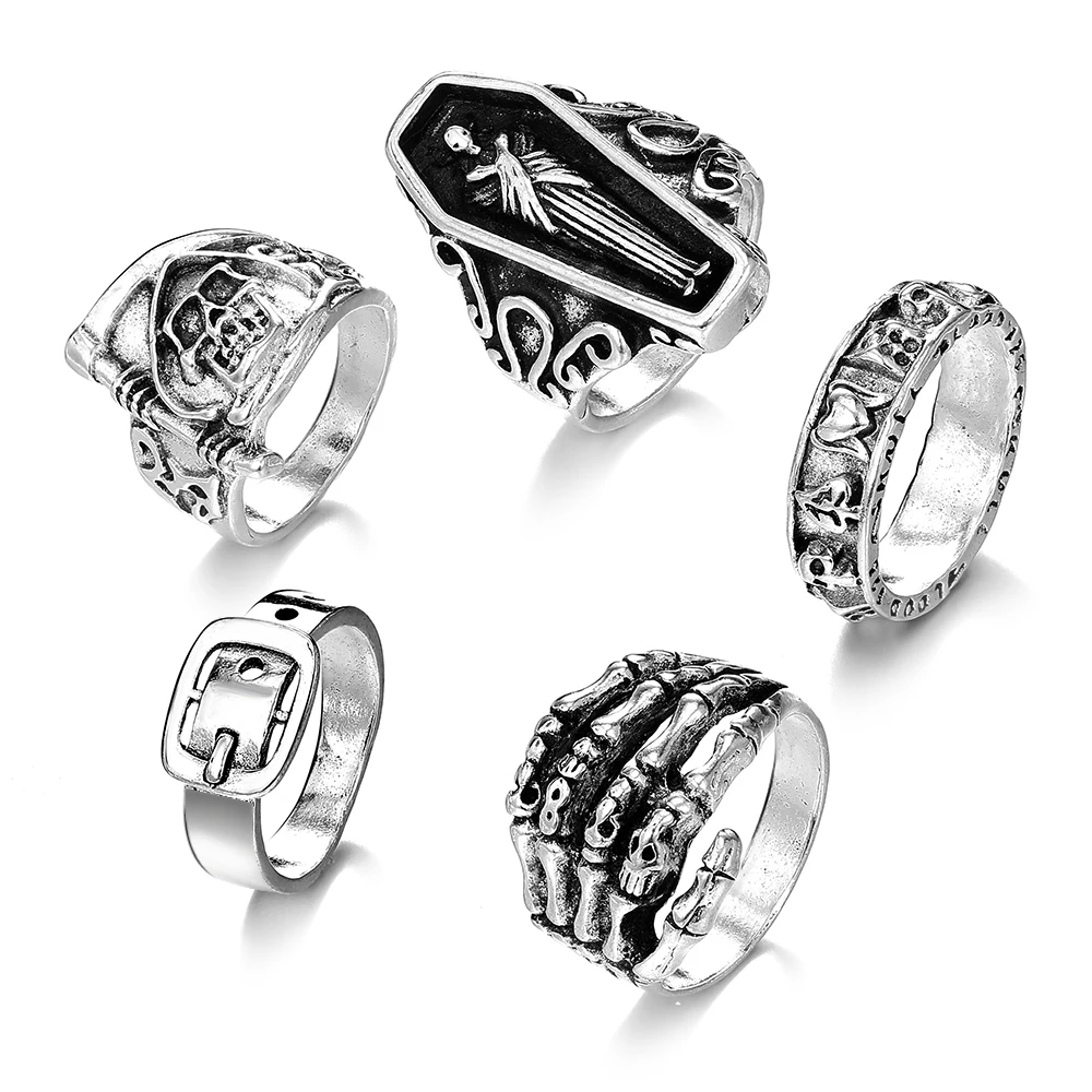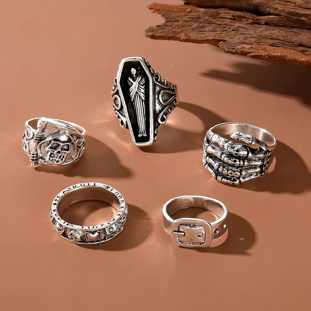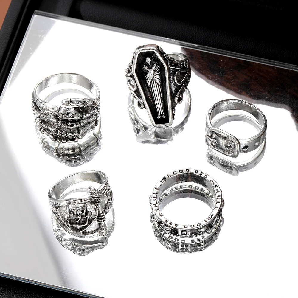 Fleepmart Vintage Gothic Ring for Women Men Creative Coffin Skeleton Hand Belt Silver Color Metal Rings Set Fashion Jewelry Gifts