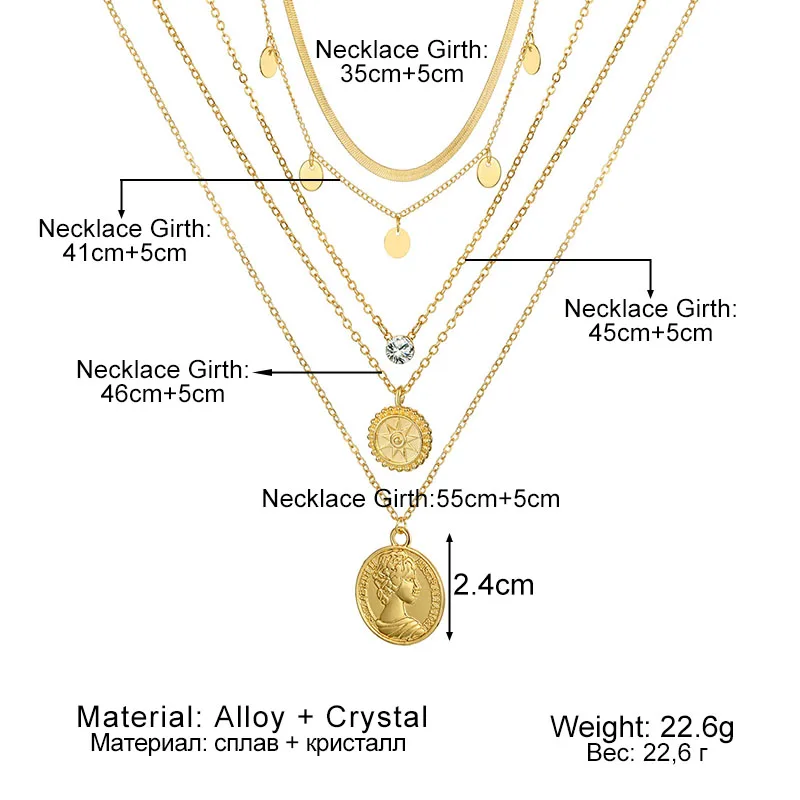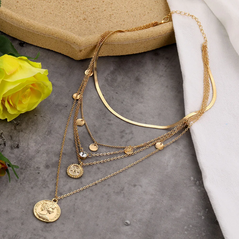 Fleepmart Vintage Multilayer Portrait Coin Pendant Necklace Bohemian Snake Chain Golden Head Coin Collar Necklace Fashion Trend Jewelry
