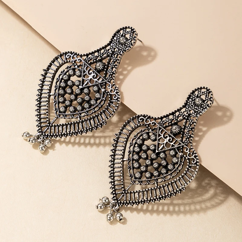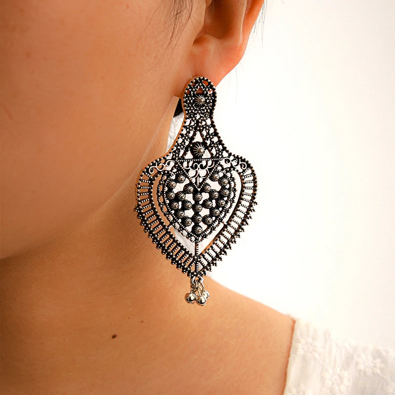 Fleepmart Vintage Silver Color Heart Drop Dangle Earrings for Women Tassel Hollow Geometry Alloy Metal Indian Gypsy Jewelry