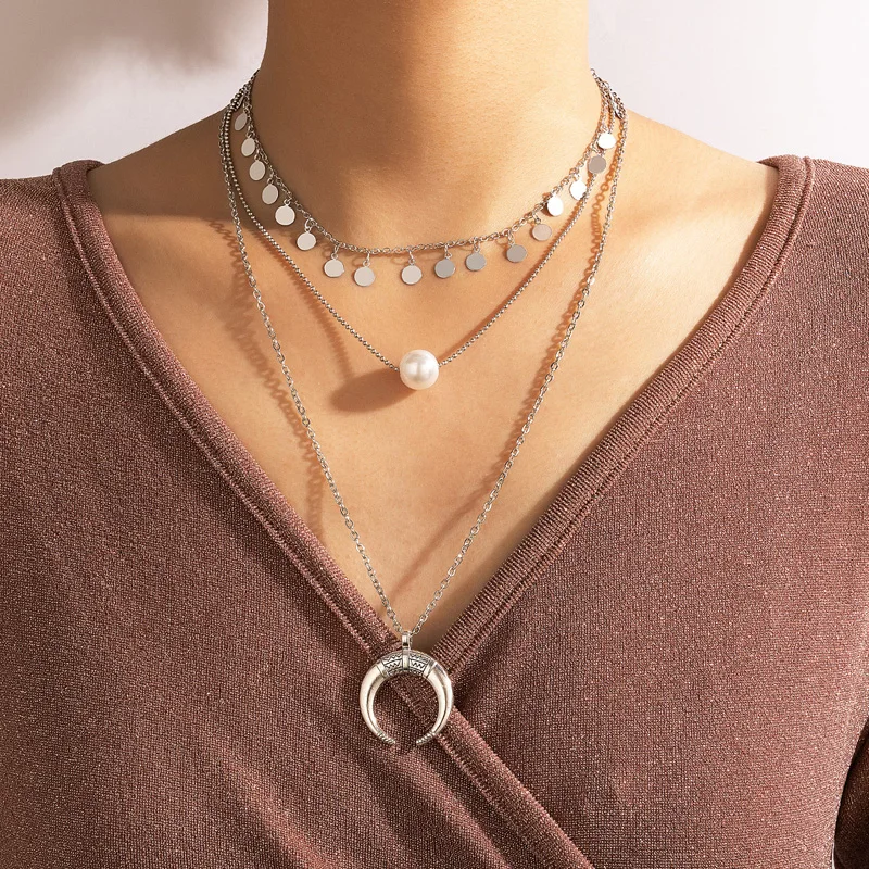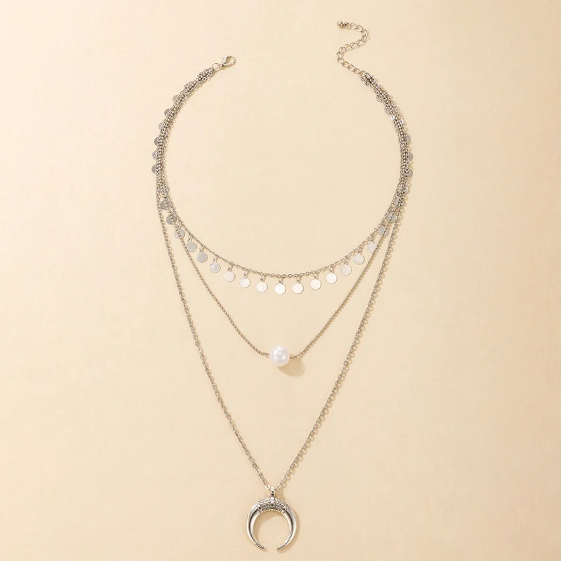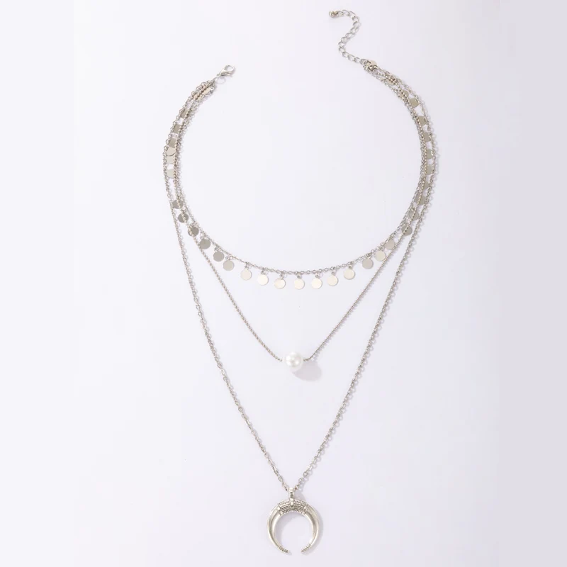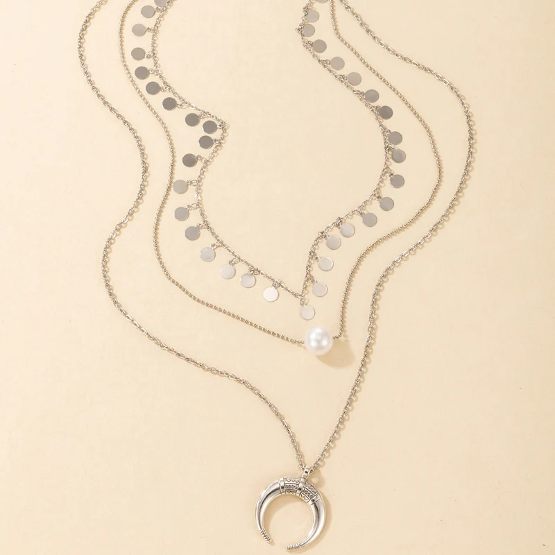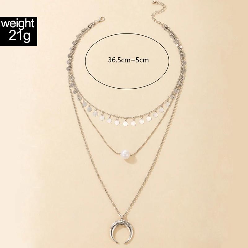 Fleepmart Vintage Silver Color Moon Bull Head Multi Layer Necklace for Women Pearl Geometric Sequins Tassel Choker Jewelry Collar
