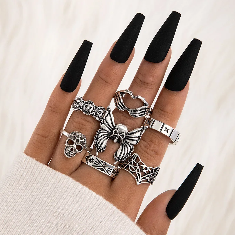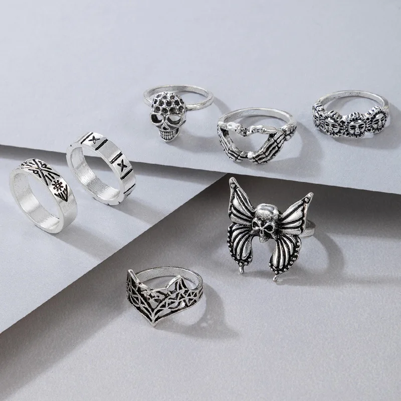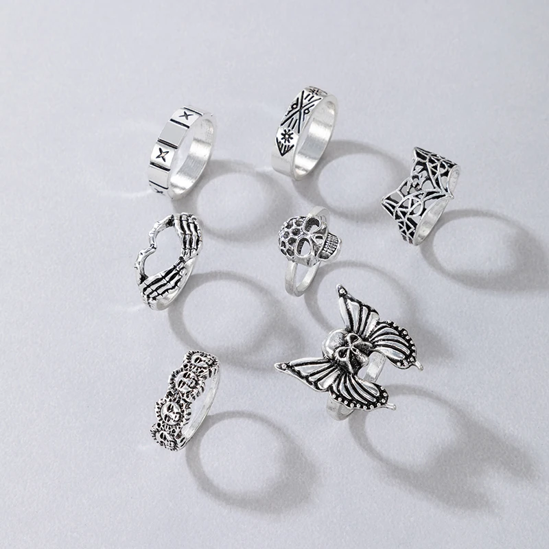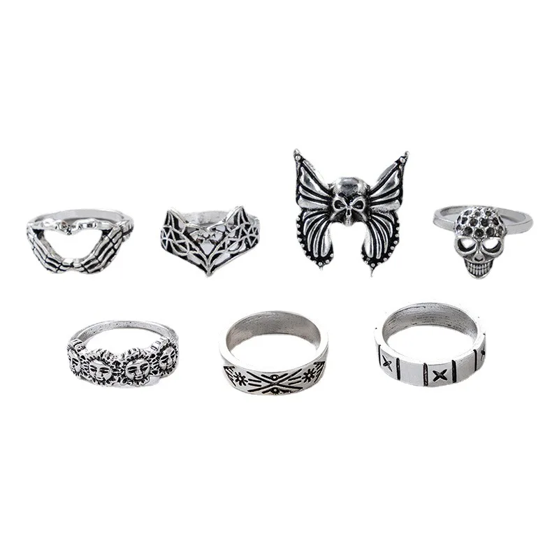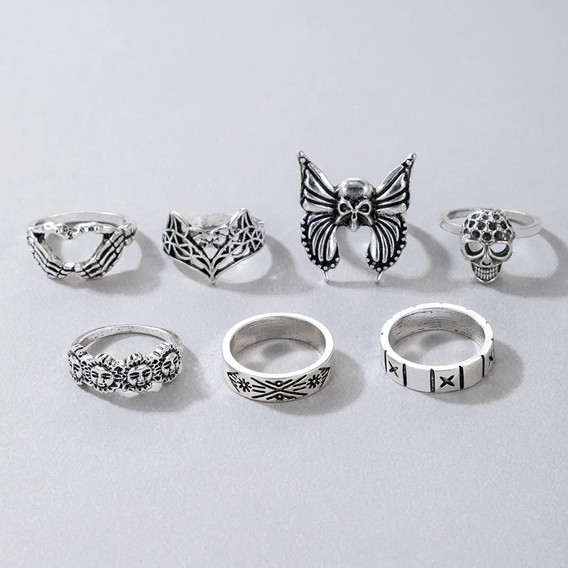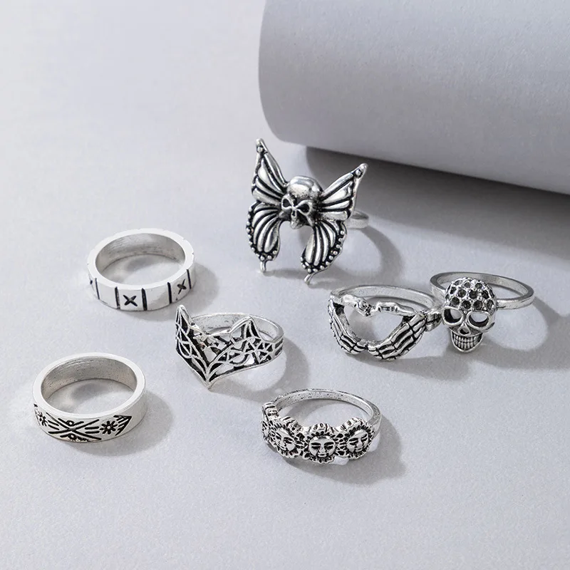 Fleepmart Vintage Silver Color Skull Butterfly Joint Ring Sets for Women Charms Sun Fox Geoemtry Jewelry Anillo 7pcs/sets