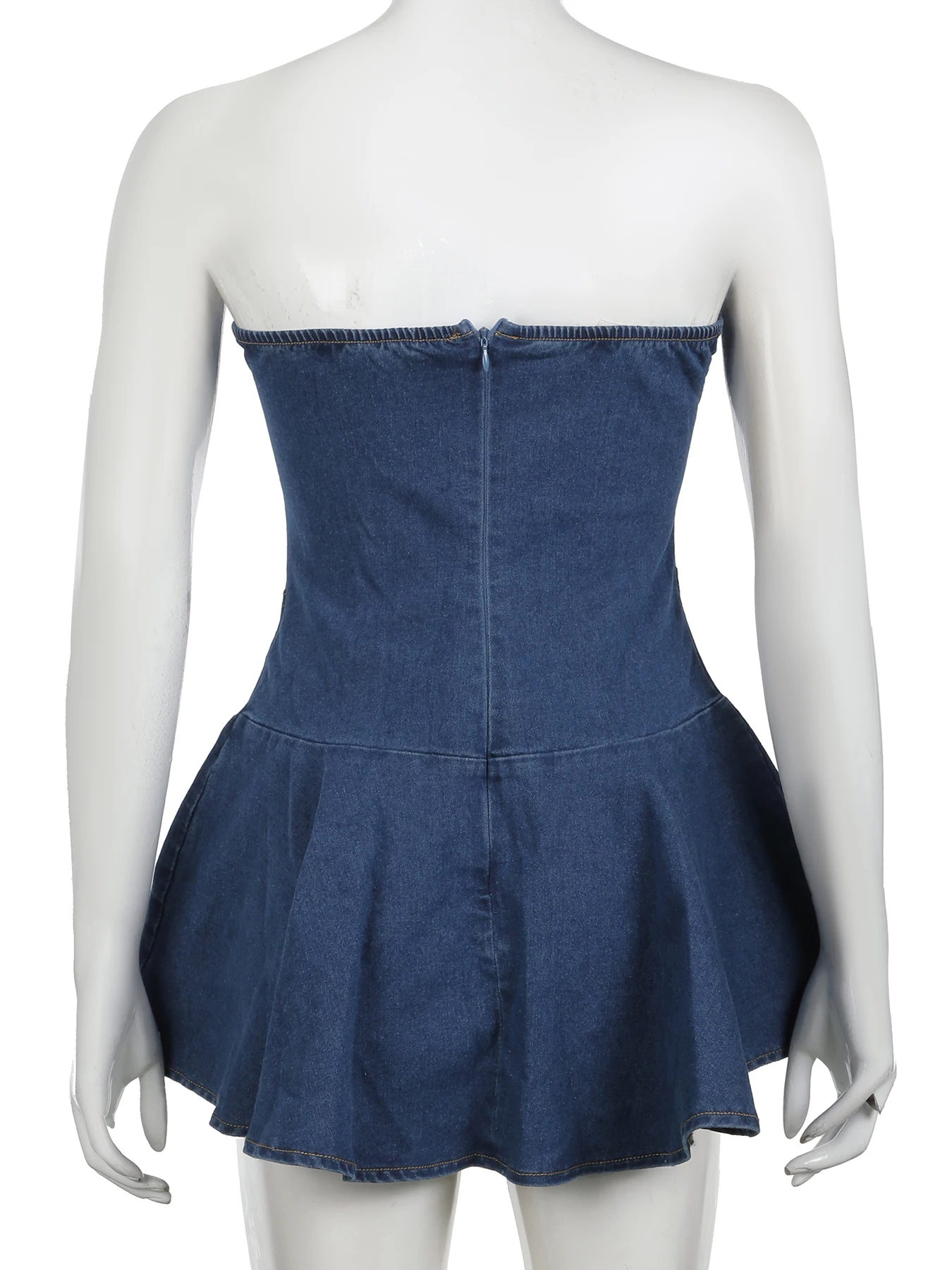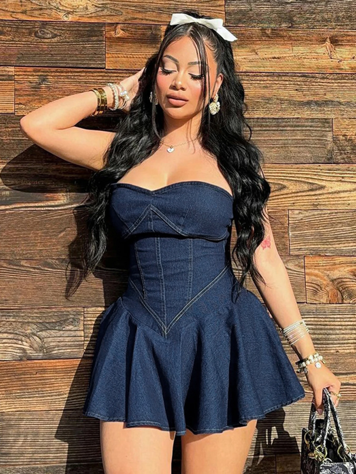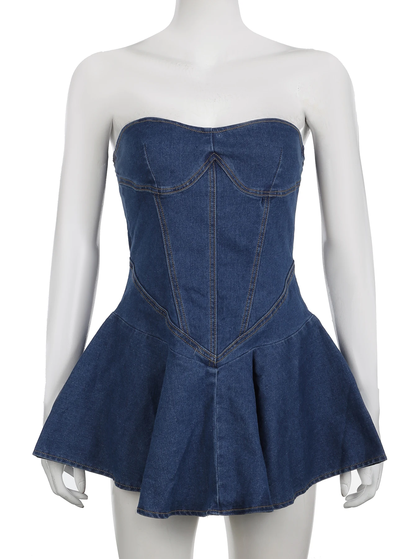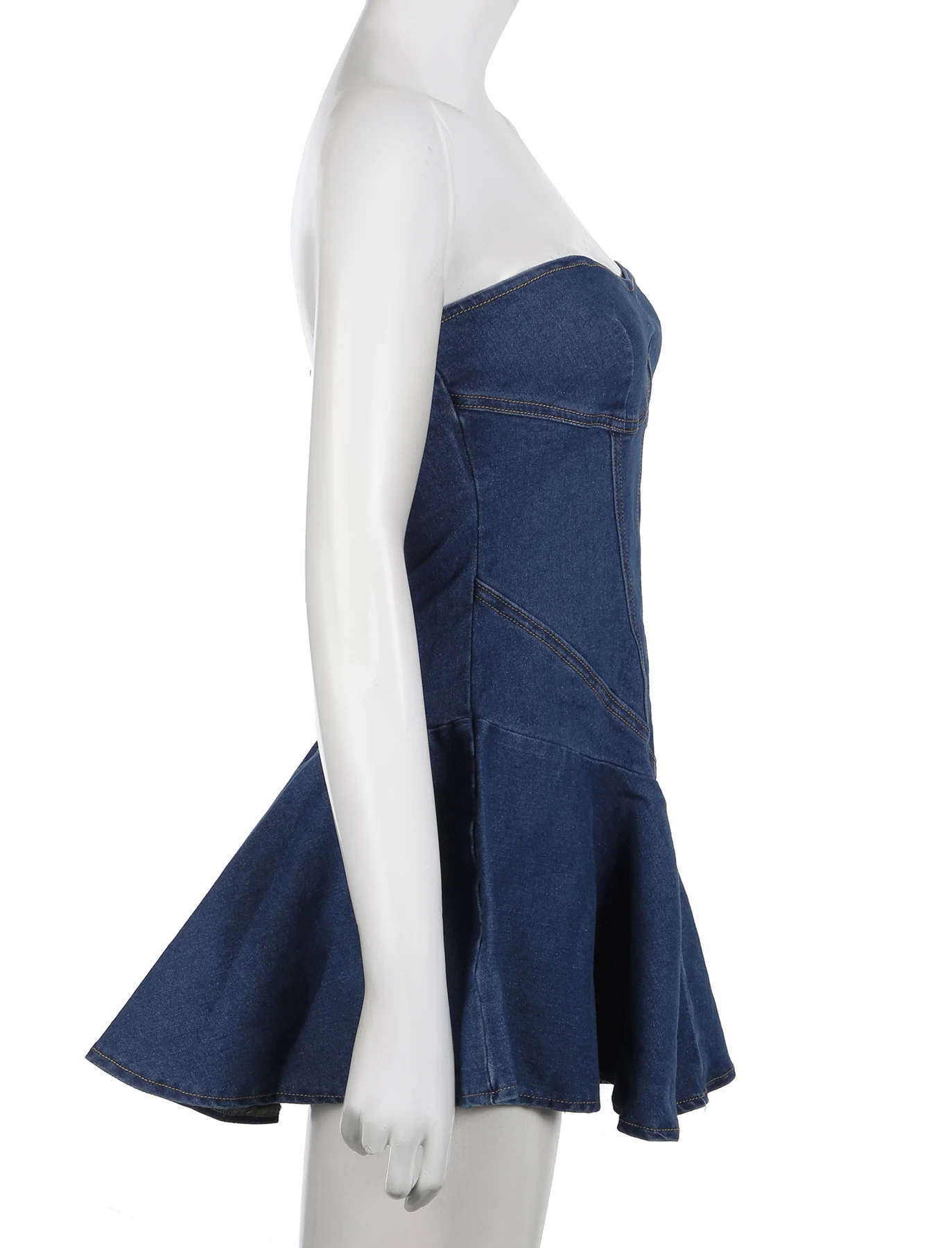 Fleepmart Vintage Strapless Denim Y2k Aesthetic Stretchy A-line Mini Fashion Korean Stretchy Ruffle Dress Women