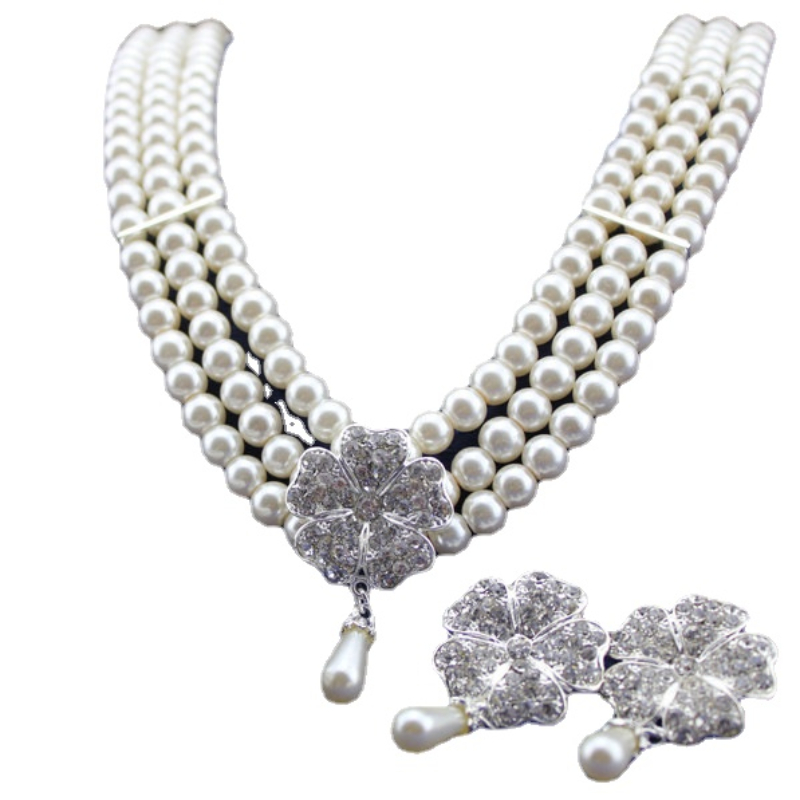 Fleepmart Wedding Jewelry Three-row Pearl Bridal Jewelry Set Rhinestone Four-leaf Clover Necklace Earring Three-piece Set Earrings