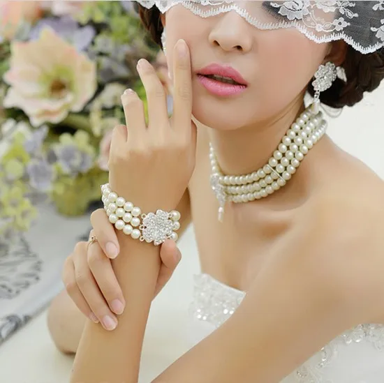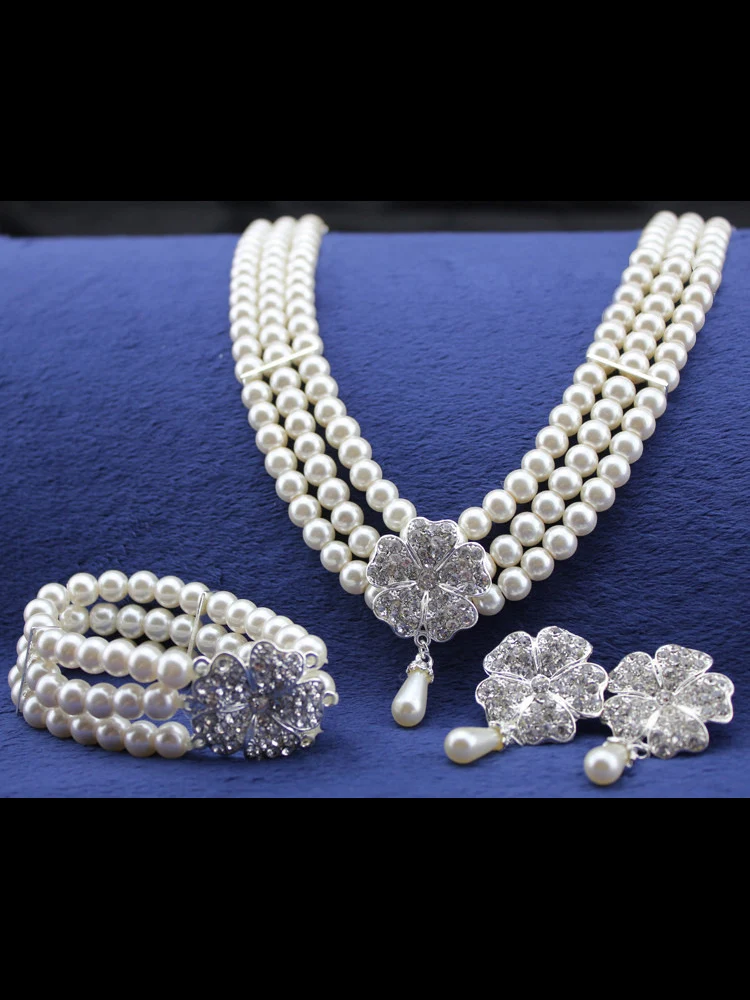 Fleepmart Wedding Jewelry Three-row Pearl Bridal Jewelry Set Rhinestone Four-leaf Clover Necklace Earring Three-piece Set Earrings
