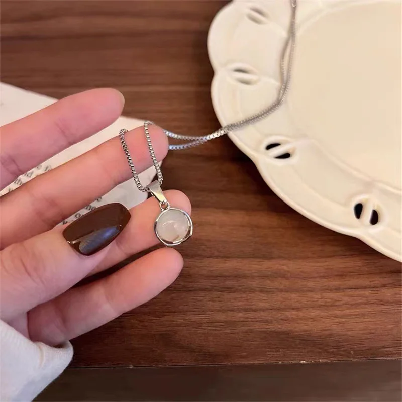 Fleepmart White Chalcedony Round Pendant Necklace Vintage Alloy Clavicle Chain Women Jewelry Party Gift