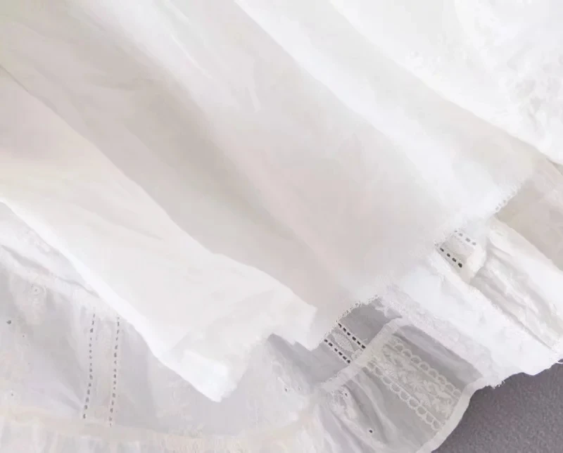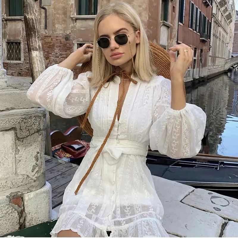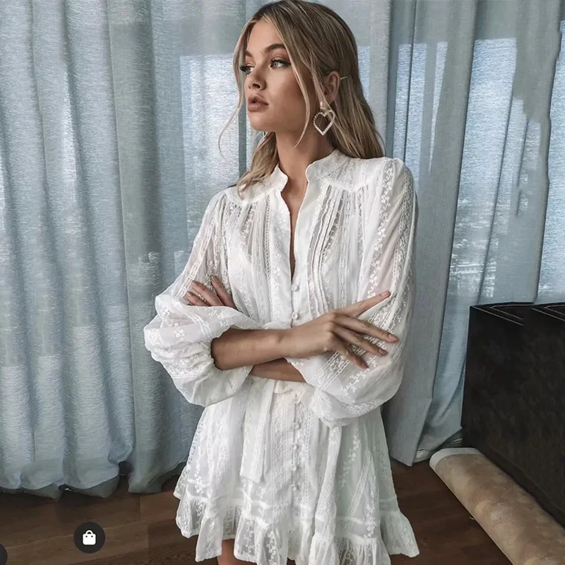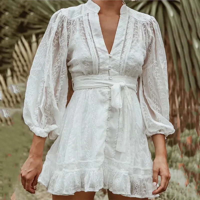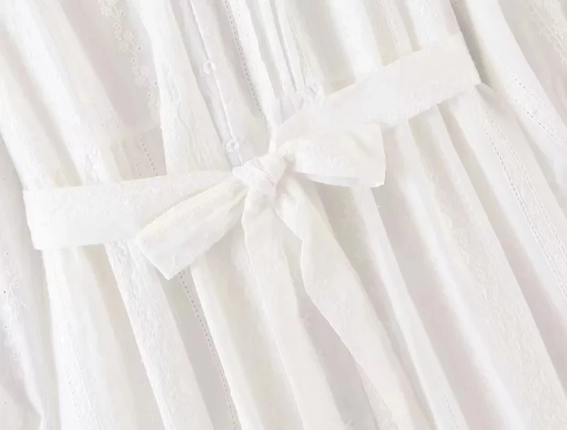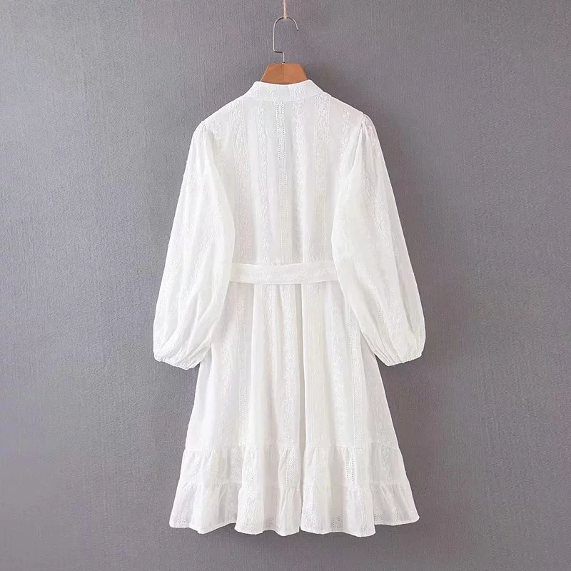 Fleepmart white embriodery dress women cotton lantern sleeve summer autumn beach dress 2024 new hollow out button sash dress