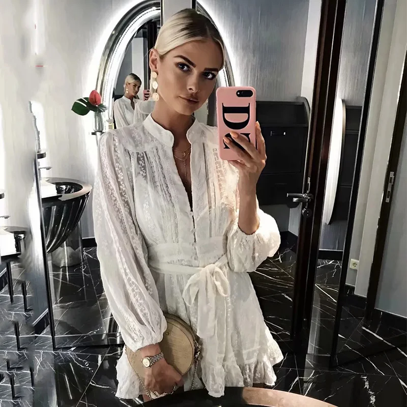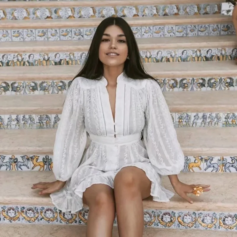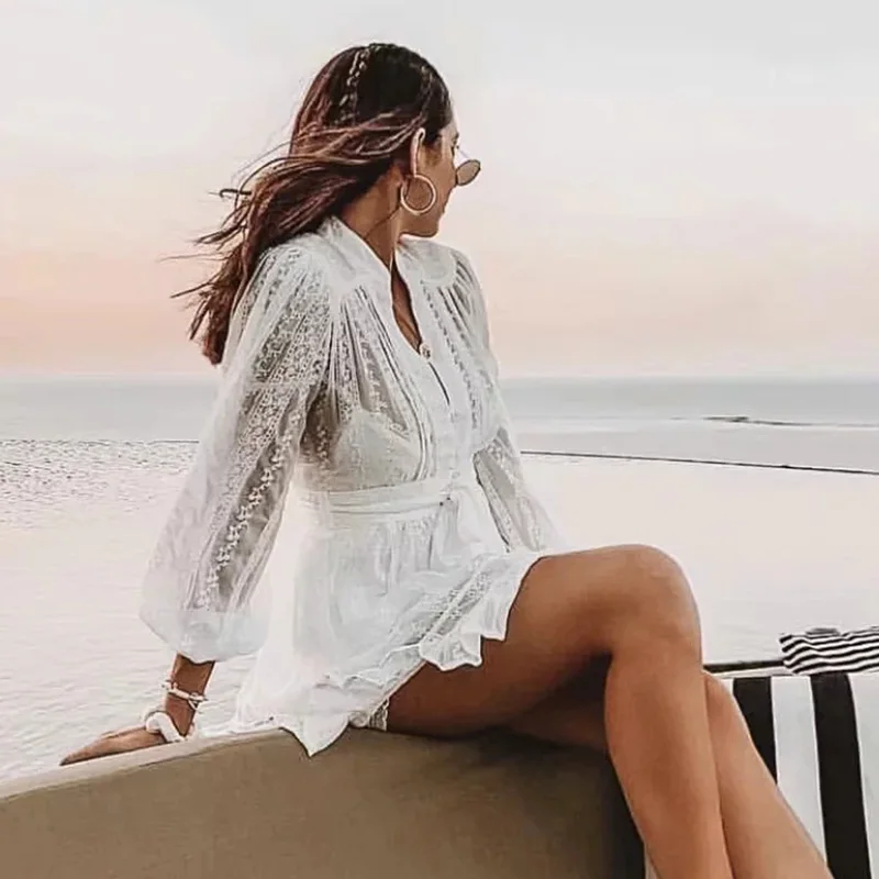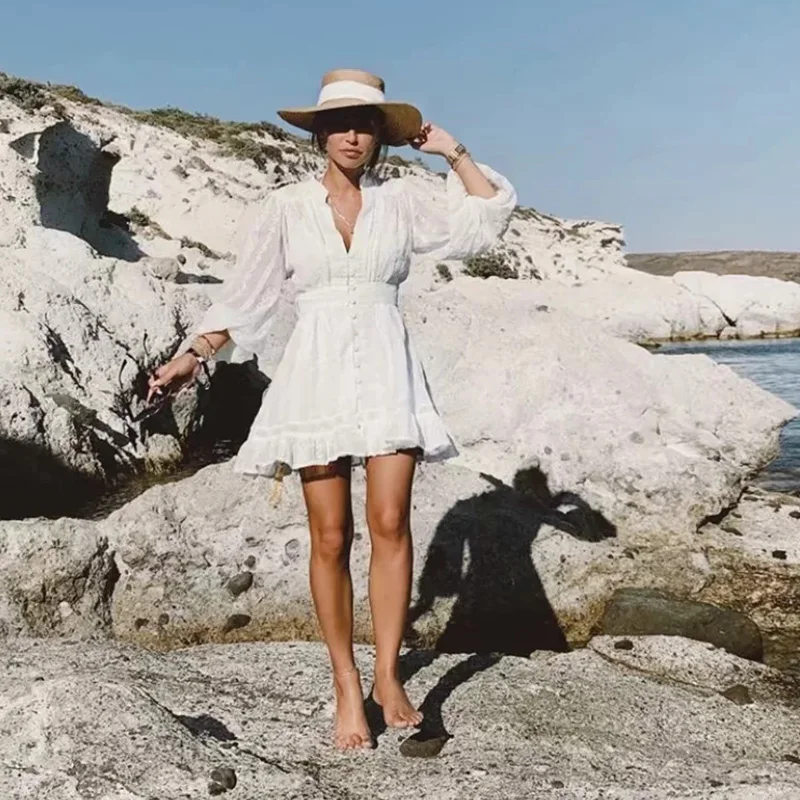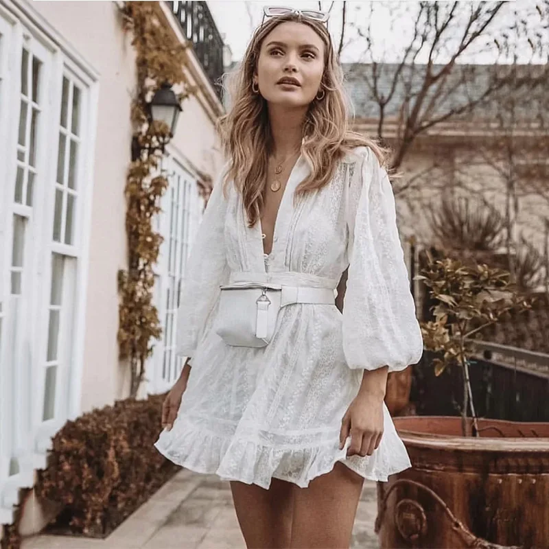 Fleepmart white embriodery dress women cotton lantern sleeve summer autumn beach dress 2024 new hollow out button sash dress