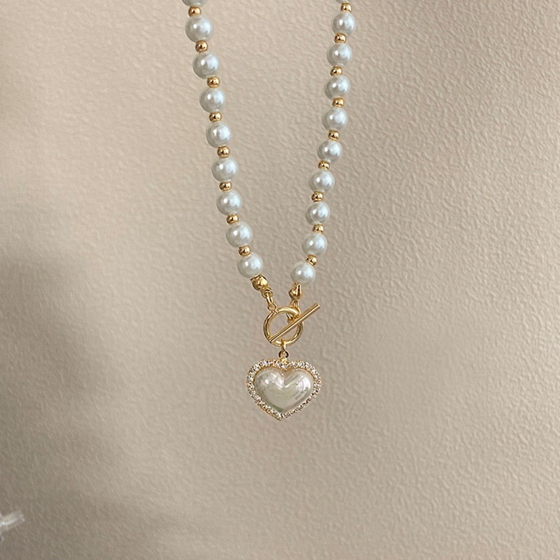 Fleepmart White Imitation Pearl Bead Necklace for Women Crystal Heart Shell Pendant Sweet Wedding Party Jewelry Collier