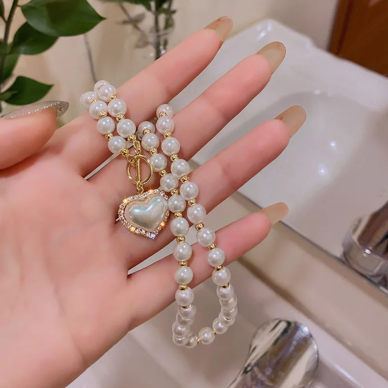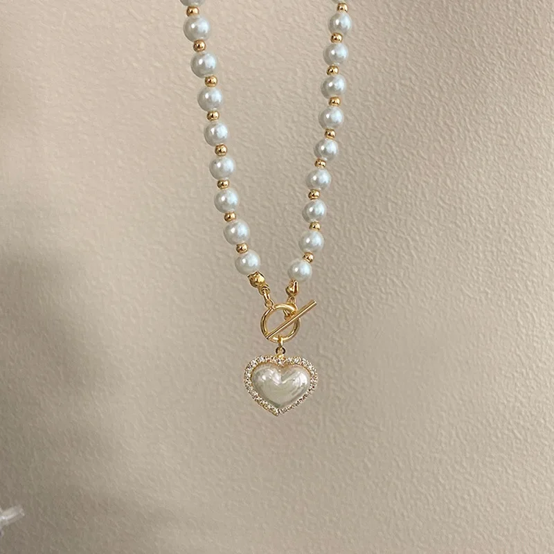 Fleepmart White Imitation Pearl Bead Necklace for Women Crystal Heart Shell Pendant Sweet Wedding Party Jewelry Collier