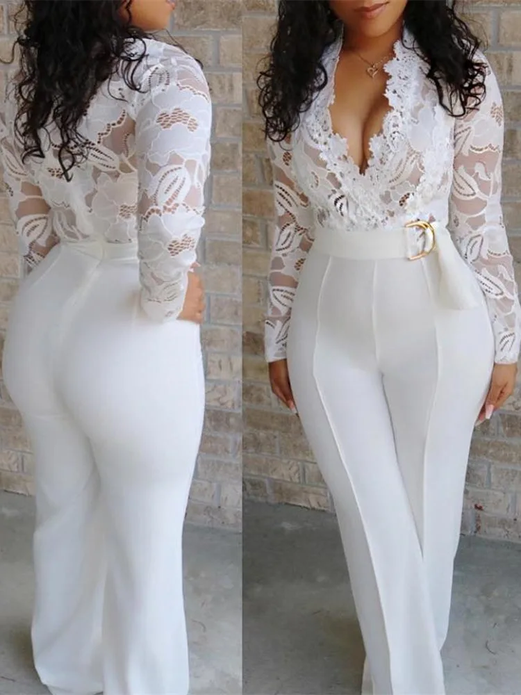 Fleepmart White Jumpsuit Women Overalls Elegant Lace Long One Piece High Waist Feather Y2k Sexy Wedding Party Night Evening Rompers