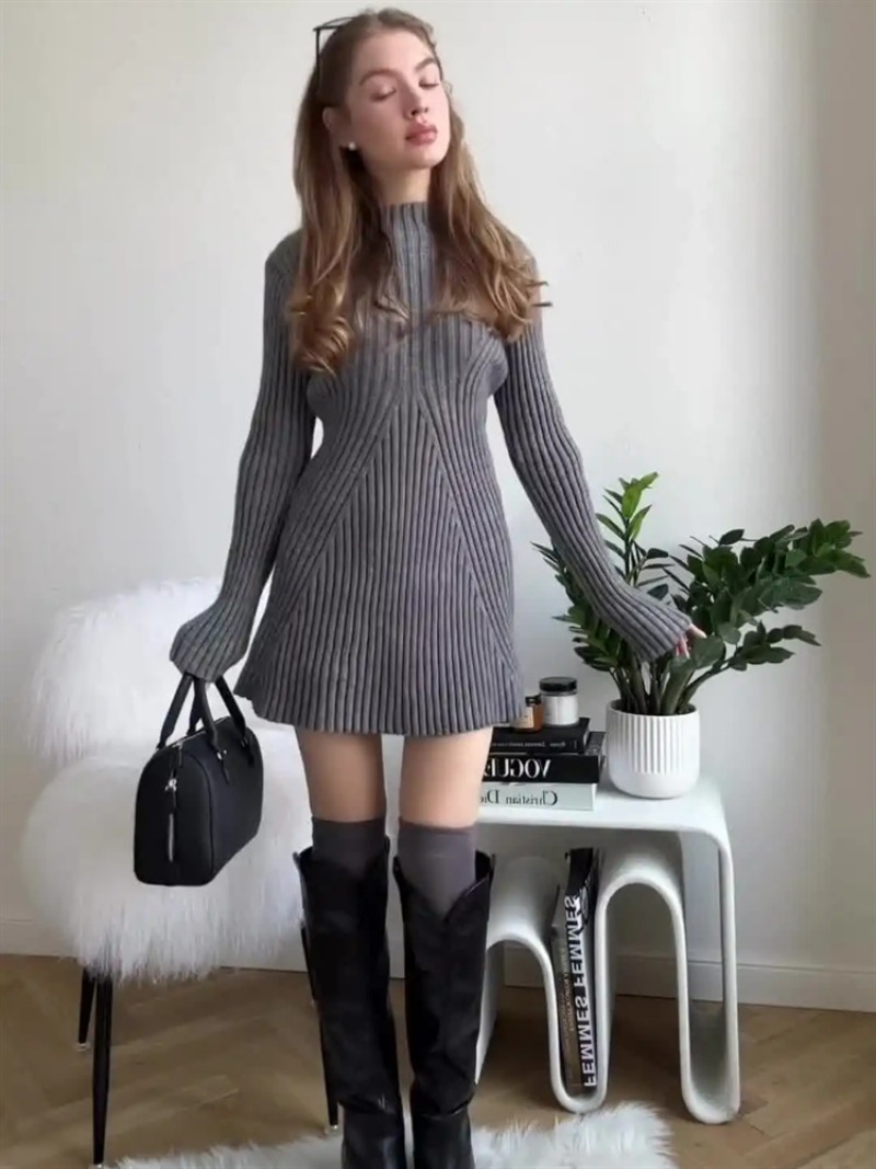 Fleepmart White Knitted Women Mini Autumn O Neck Long Sleeve Short Dress Elegant Office Lady Streetwear