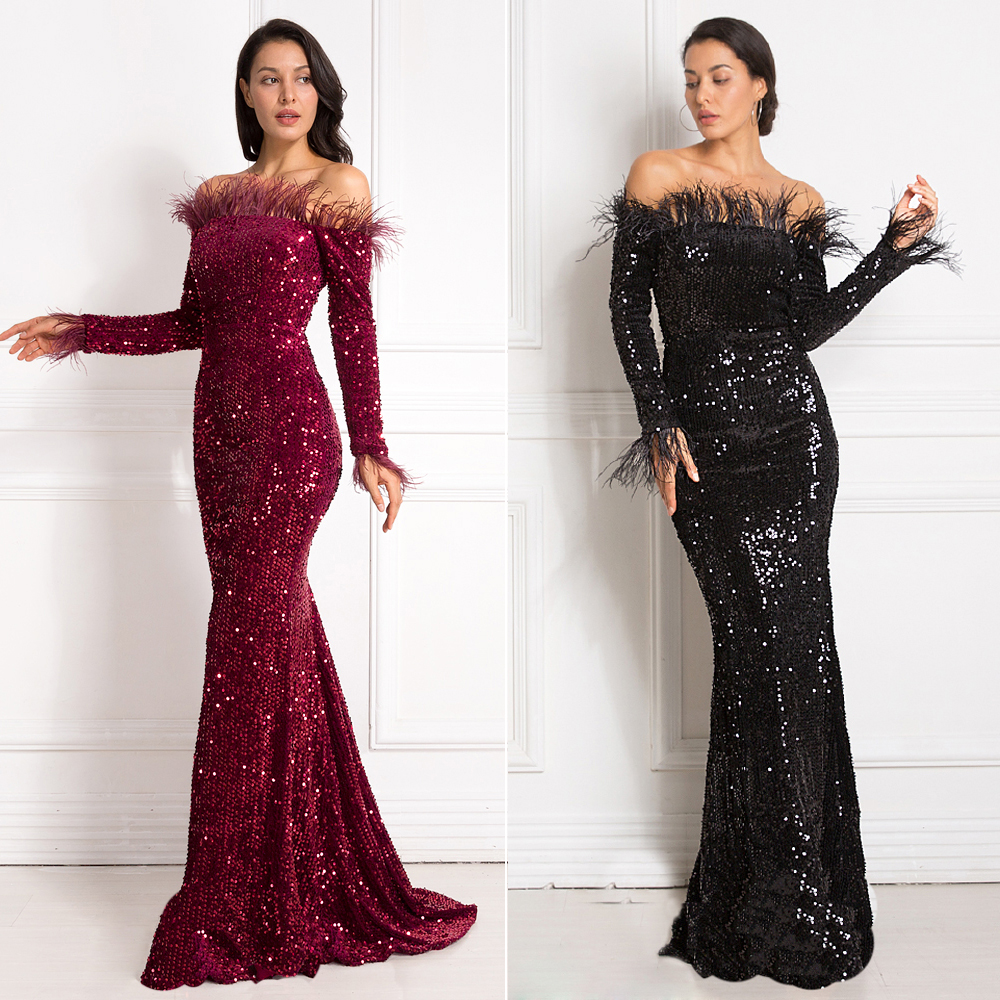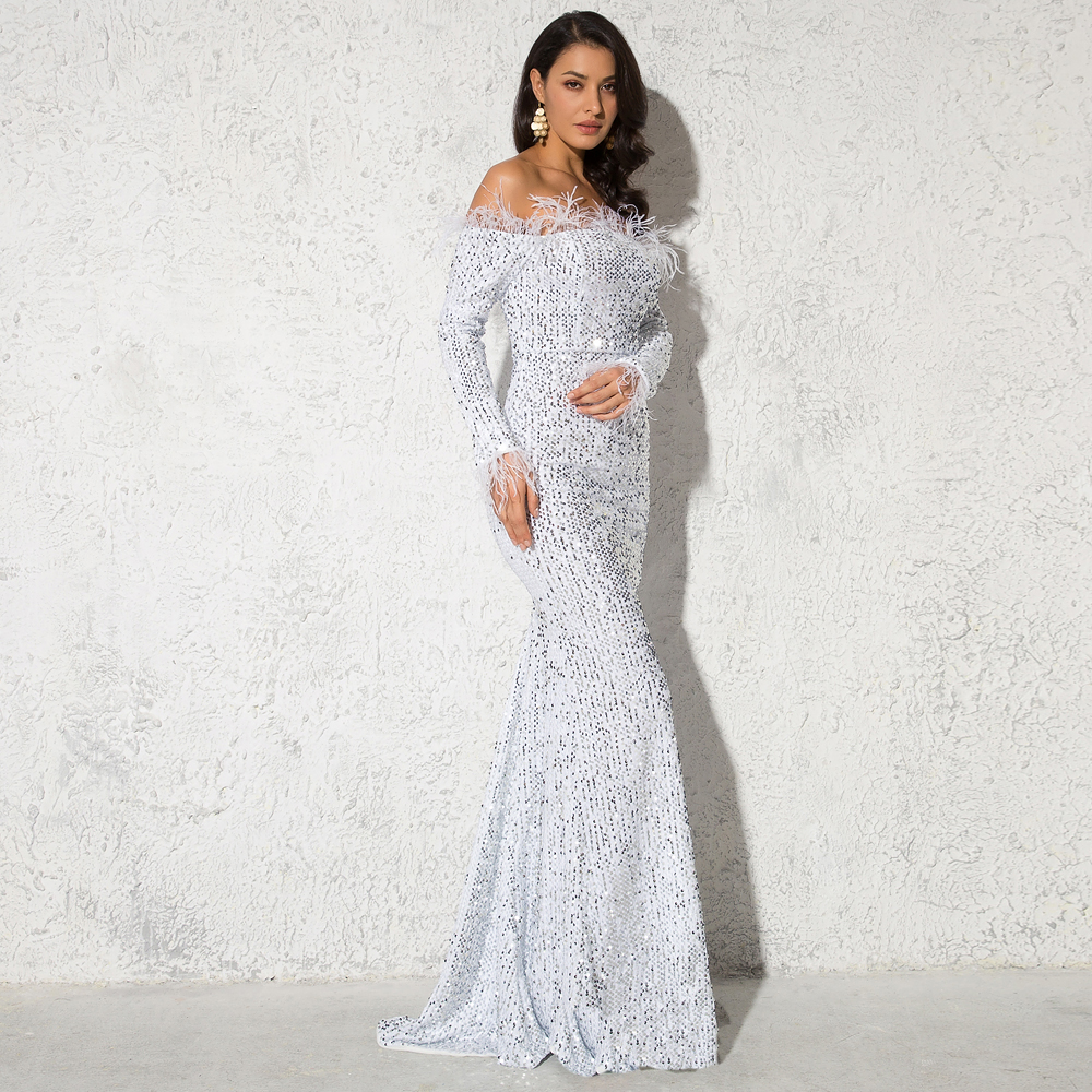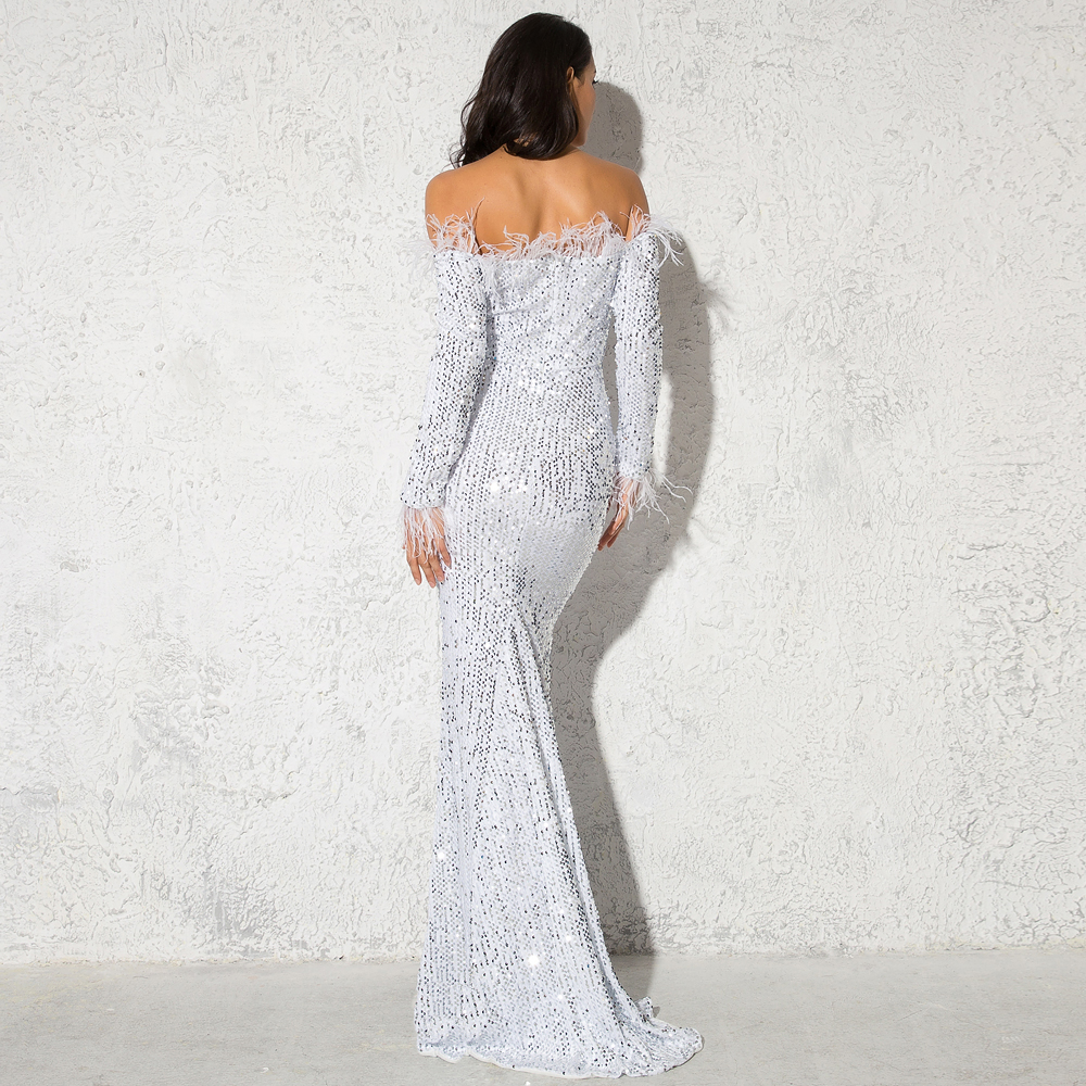 Fleepmart White Sequined Feather Slash Neck Maxi Dress Patchwork Stretch Shiny Long Sleeve Floor Length Bodycon Evening Party Dress