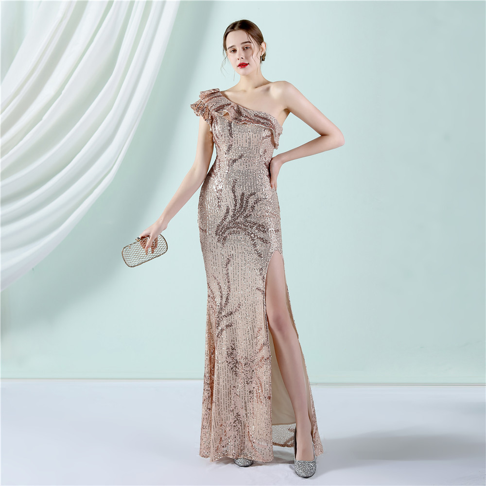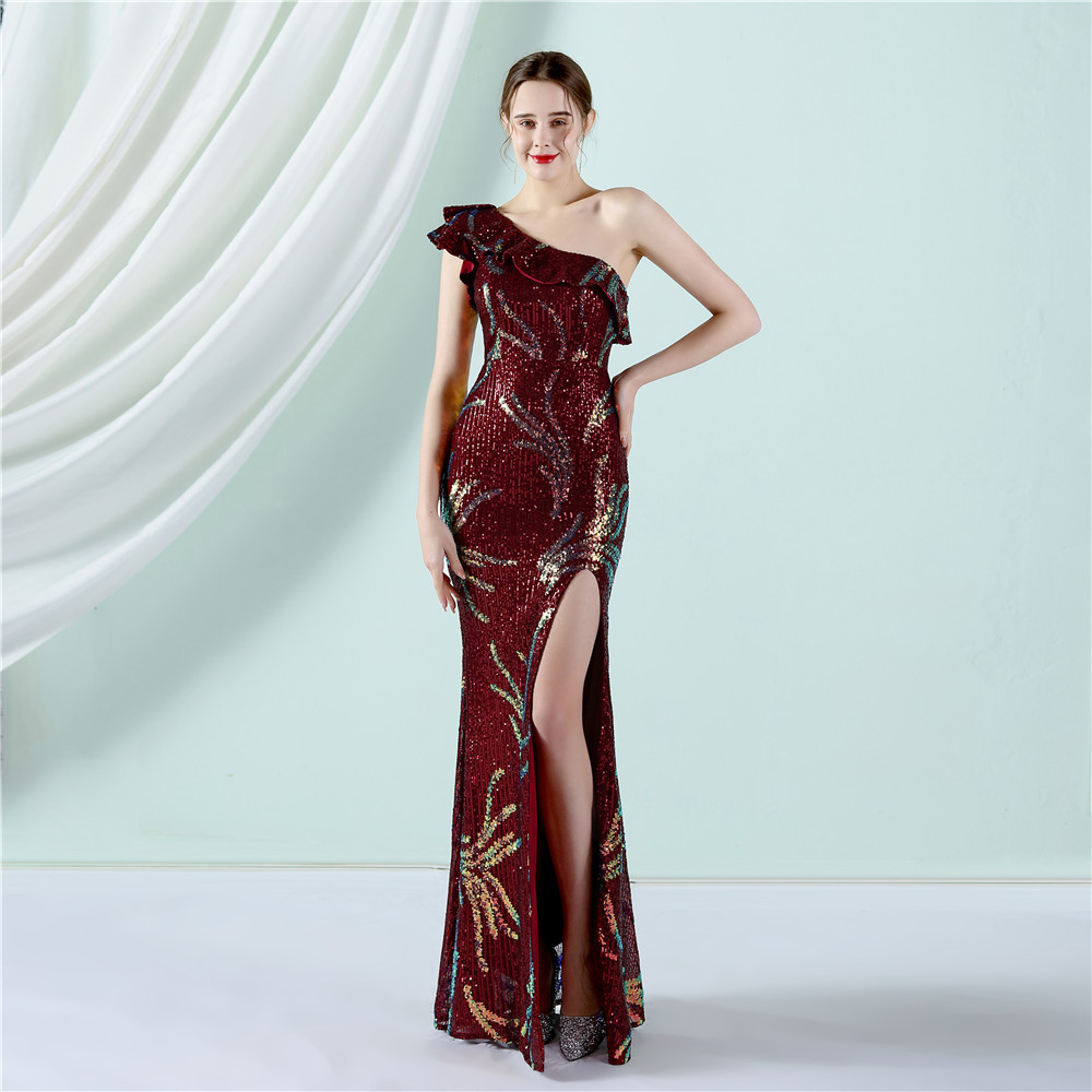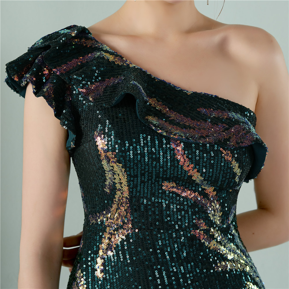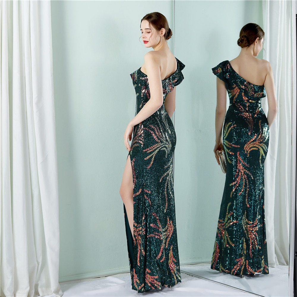 Fleepmart Women 2022 New Elegant One Shoulder Floor Length Evening Dress Sexy Hight Slit Sequin Flower Party Maxi Dress Vestidos
