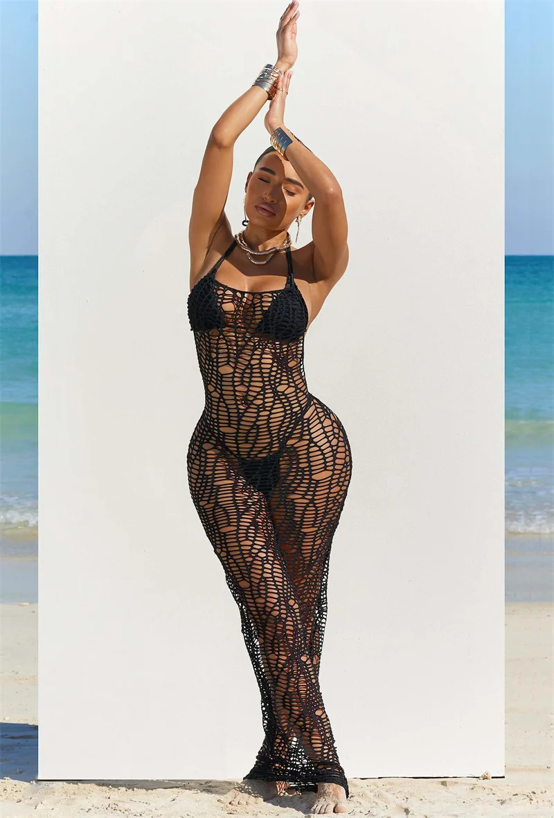 Fleepmart Women 3 Pieces Sexy Beach Bikini Set Backless Knit Long Dress Cover Up Lace Up Halter Bra Underwear