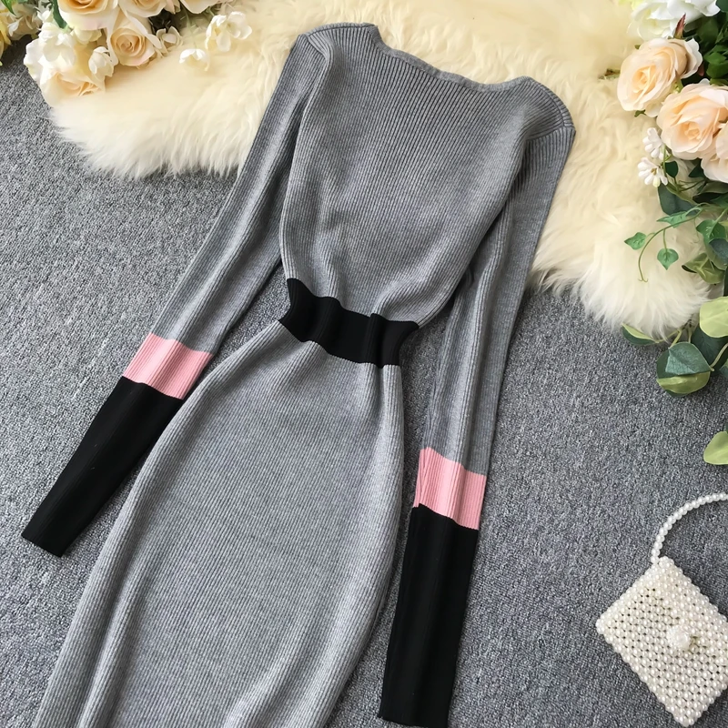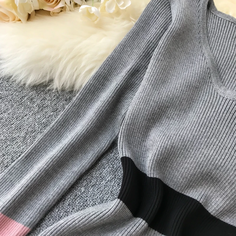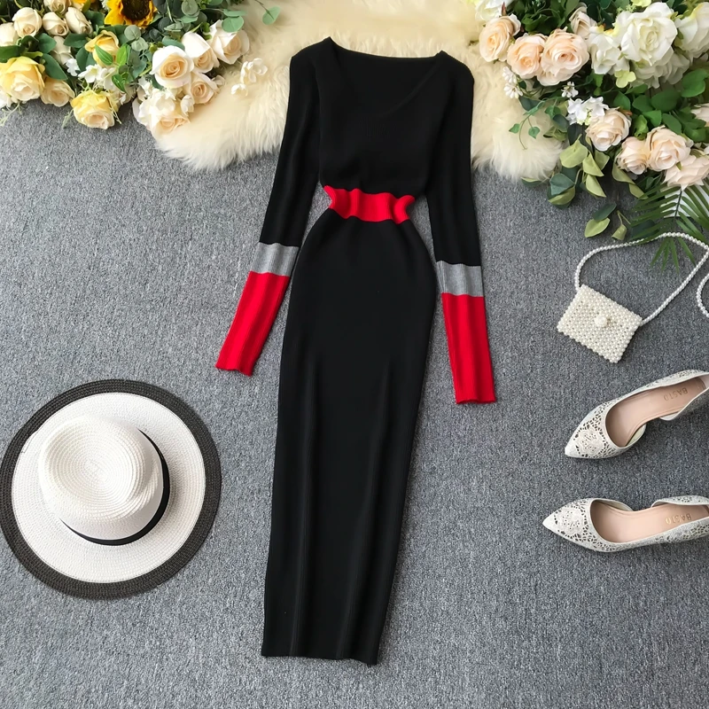 Fleepmart Women Autumn Spring Knitting Sweater Dress Fashion Patchwork V Neck Slim Elastic Bodycon Pullovers Knitting Dresses