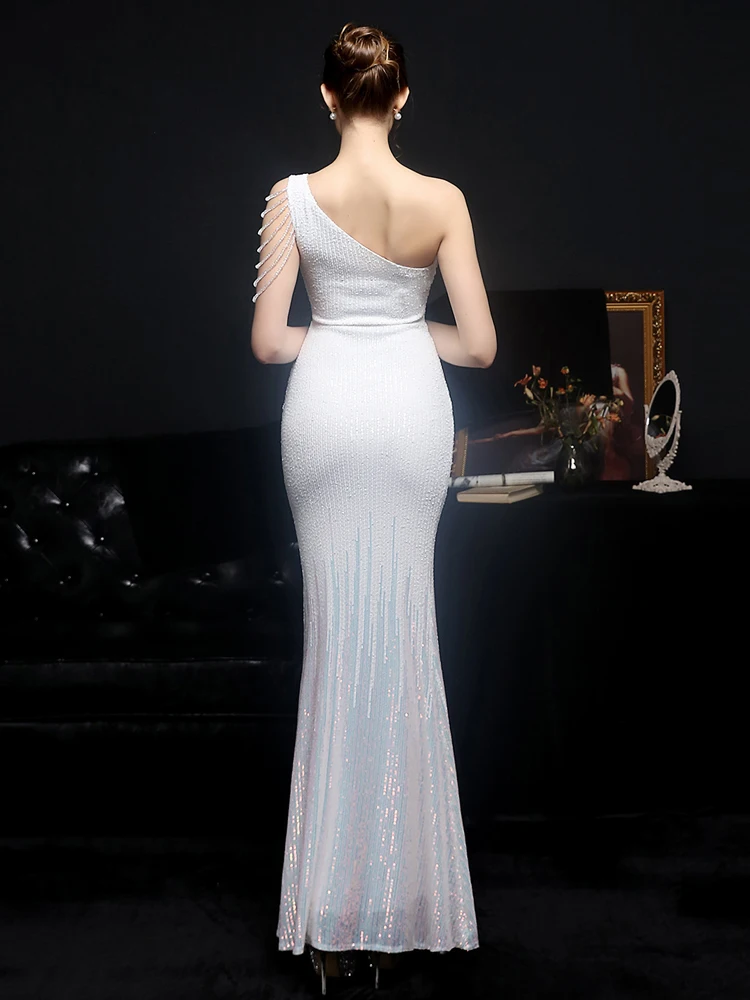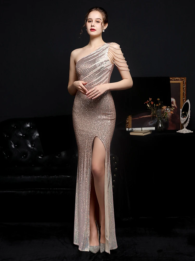 Fleepmart Women Beads Party Dress Elegant One Shoulder Slit Sequin Prom Dress 2022