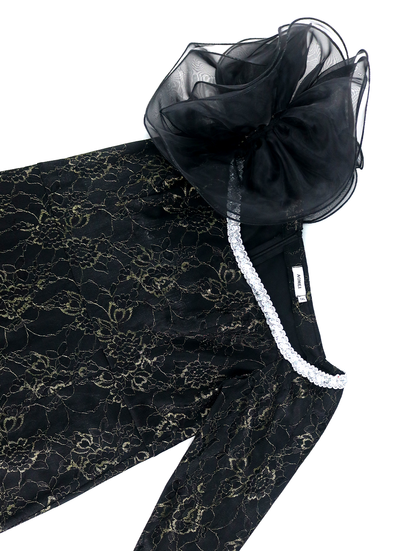 Fleepmart Women Black Lace Dress One Shoulder Skew Collar 3D Flower Ruffles Irregular Slit Sexy Slim Party Event Occasion Gowns
