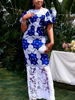 Fleepmart Women Blue Printed Party Dress Lace Patchwork Puff Short Sleeve Sheath Elegant Celebrate Event Gown Big Size 4XL Plus Size