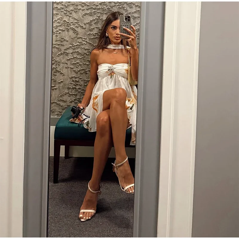 Fleepmart Women Casual Printed Pleated Scarf Collar Mini Dresses Chic Sleeveless Off Shouder Short Vestido Summer Lady Party Beach Robe