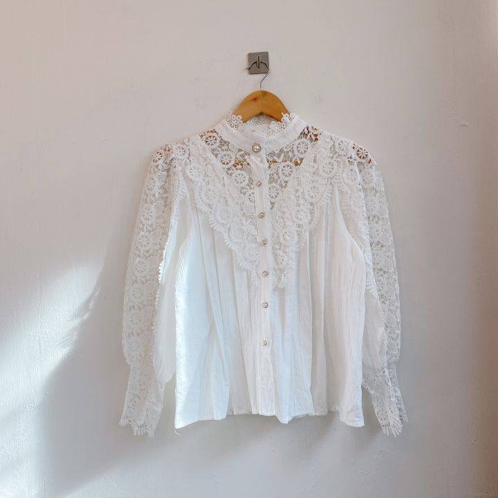 Fleepmart Women Chiffon Button Turtleneck Shirt Chic Elegant Floral Lace Fluffy Long Sleeve Top Fashion Hollow Oversize White Blouse 2024