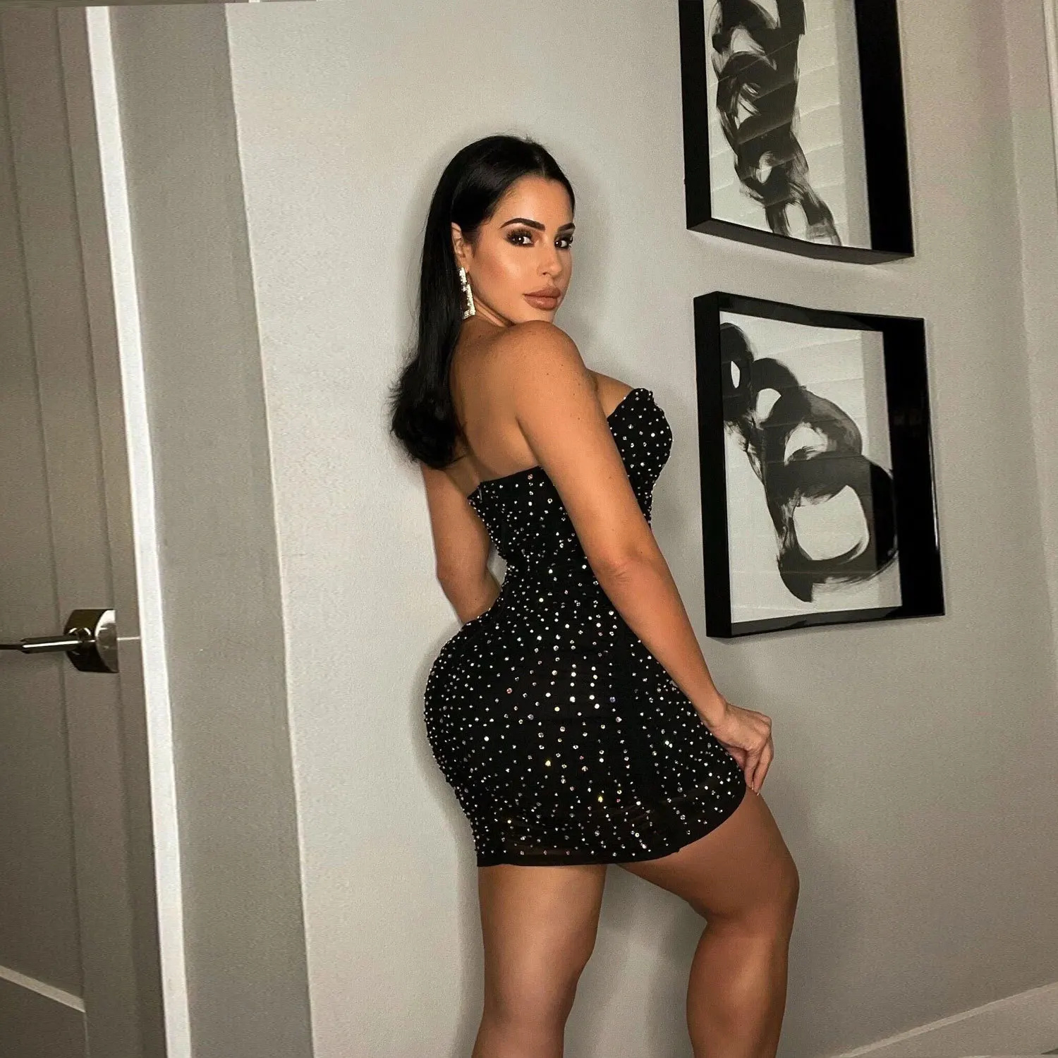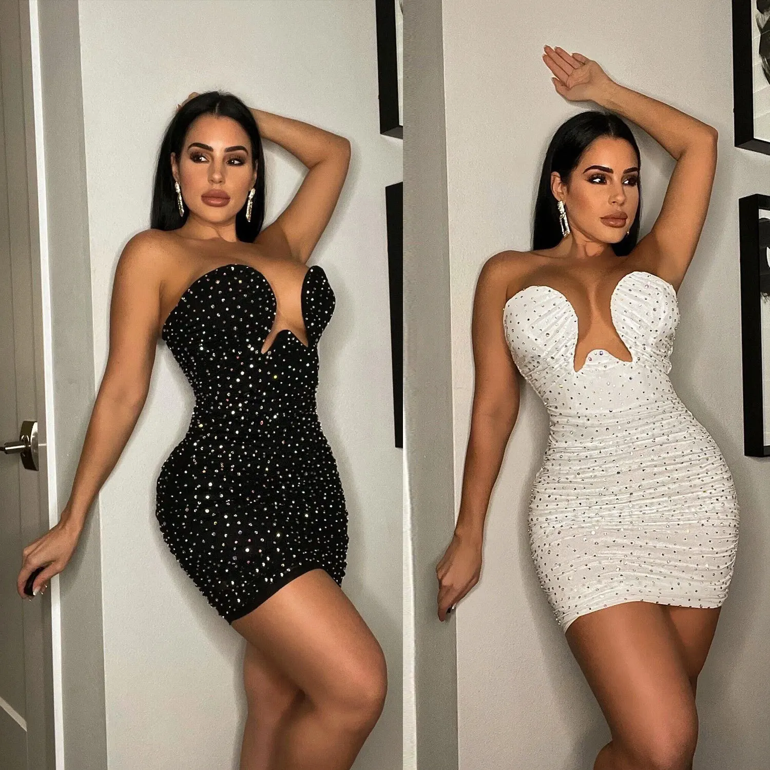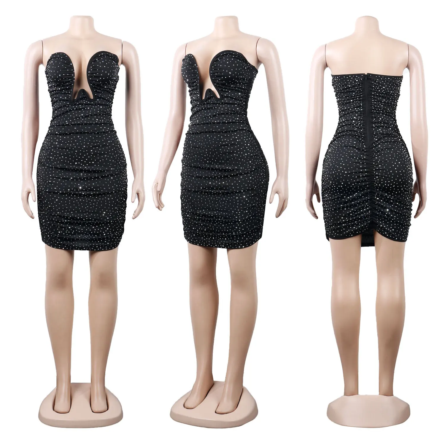 Fleepmart Women Diamonds Crystal Patchwork Mini Dress2024 Summer Sexy Strapless Backless V Neck Evening Party Club Dresses Outfit Vestidos