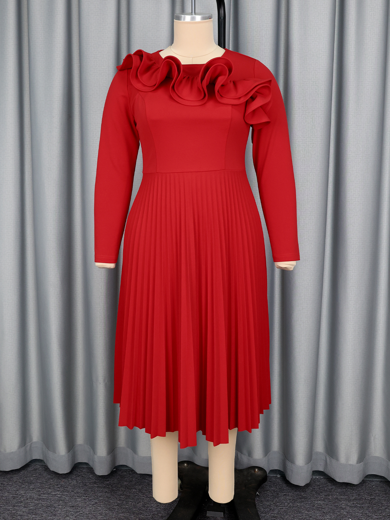 Fleepmart Women Elegant A Line Red Dress With 3D Ruffles O Neck Long SLeeve Pleated Classy Stylish Party Evening Wedding Celebration Gown