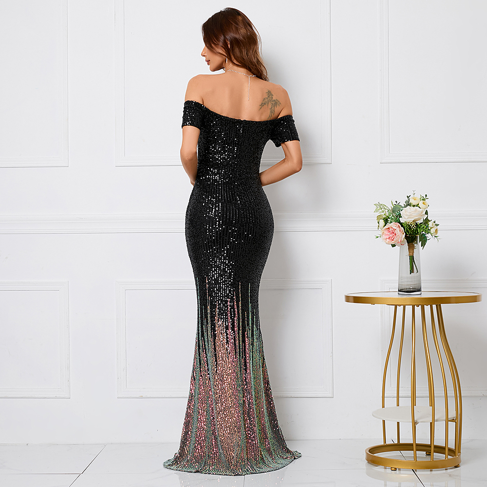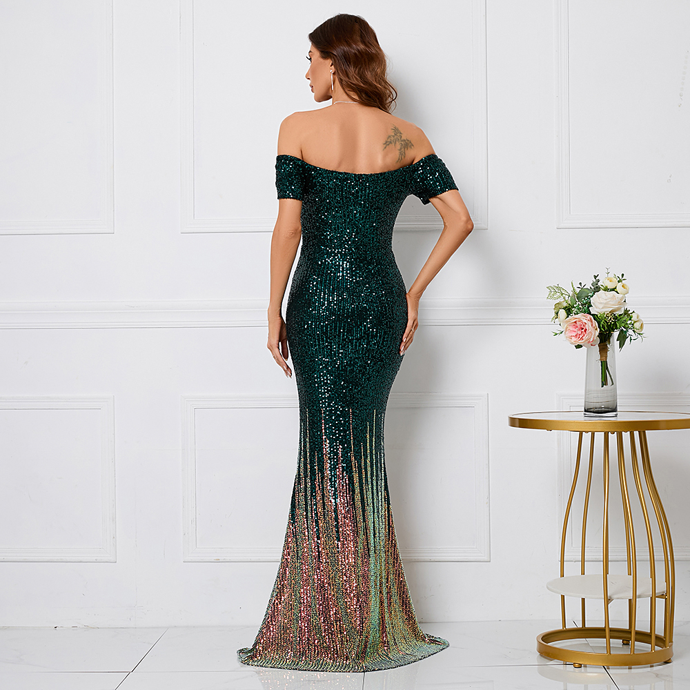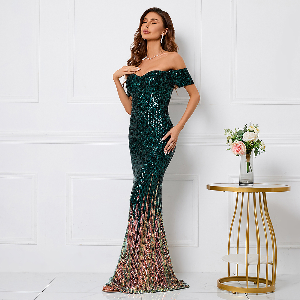 Fleepmart Women Elegant Boat Neck Party Maxi Dress Off Shoulder Green Sequin Evening Dress Long Prom Dress
