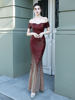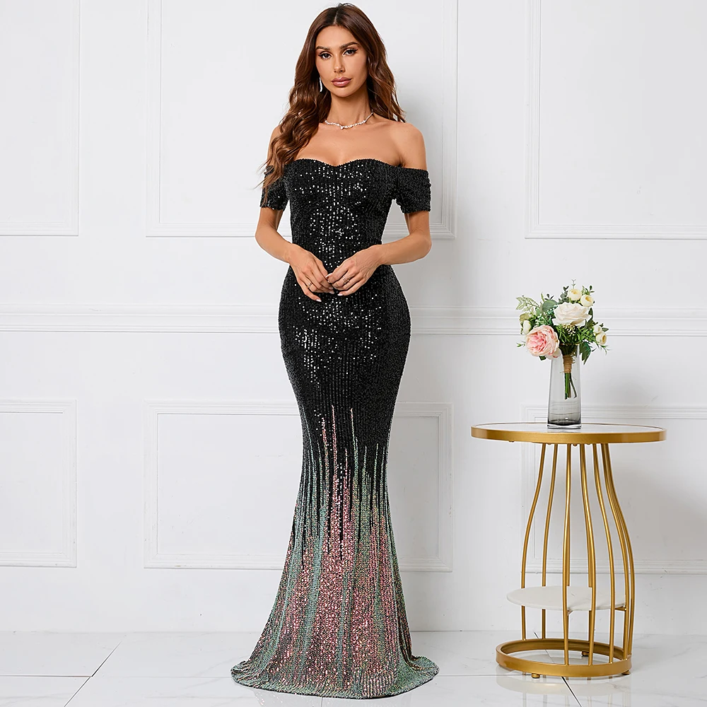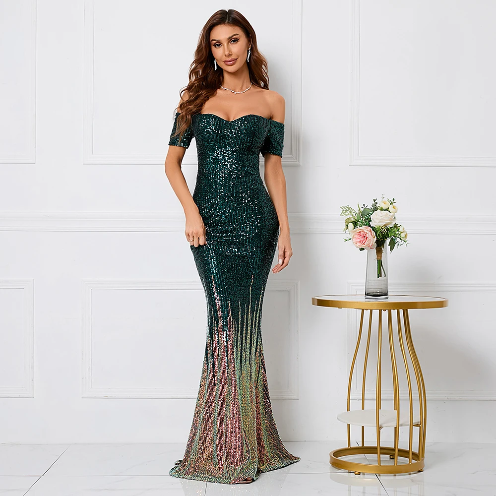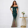 Fleepmart Women Elegant Boat Neck Party Maxi Dress Off Shoulder Green Sequin Evening Dress Long Prom Dress
