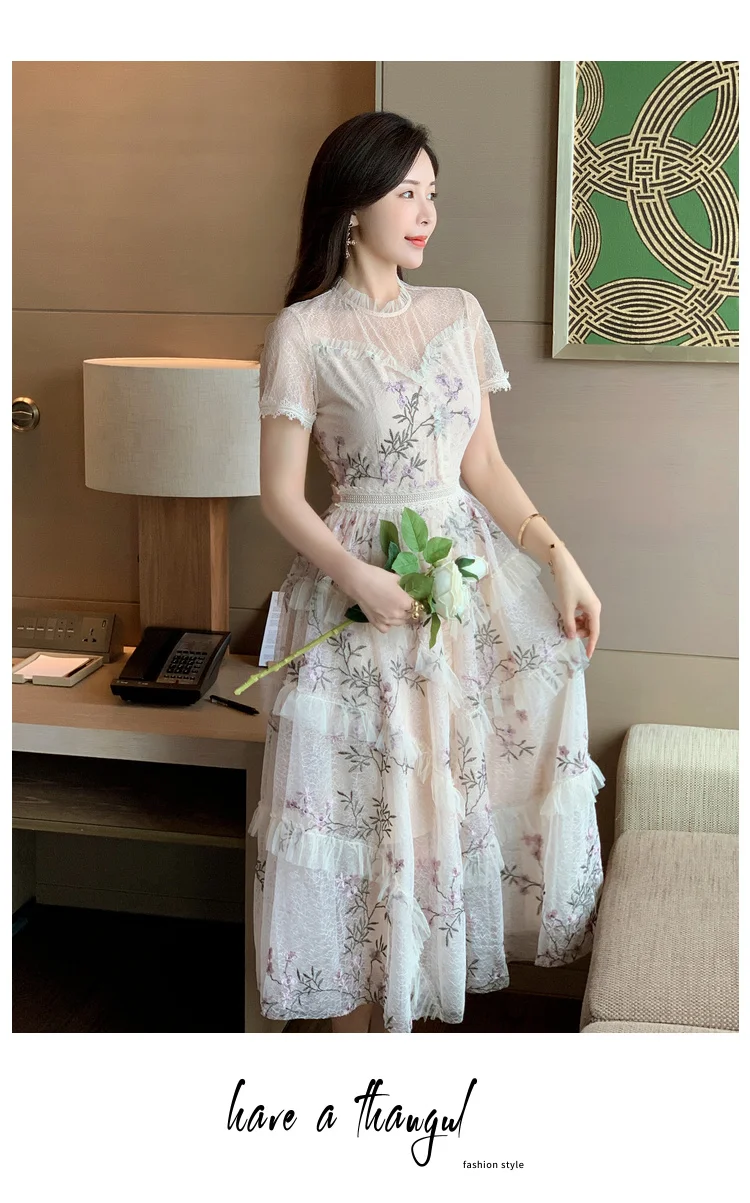 Fleepmart Women Elegant Embroidery Gauze Slim Long Dress Woman Formal Prom Party Birthday Dress for Women