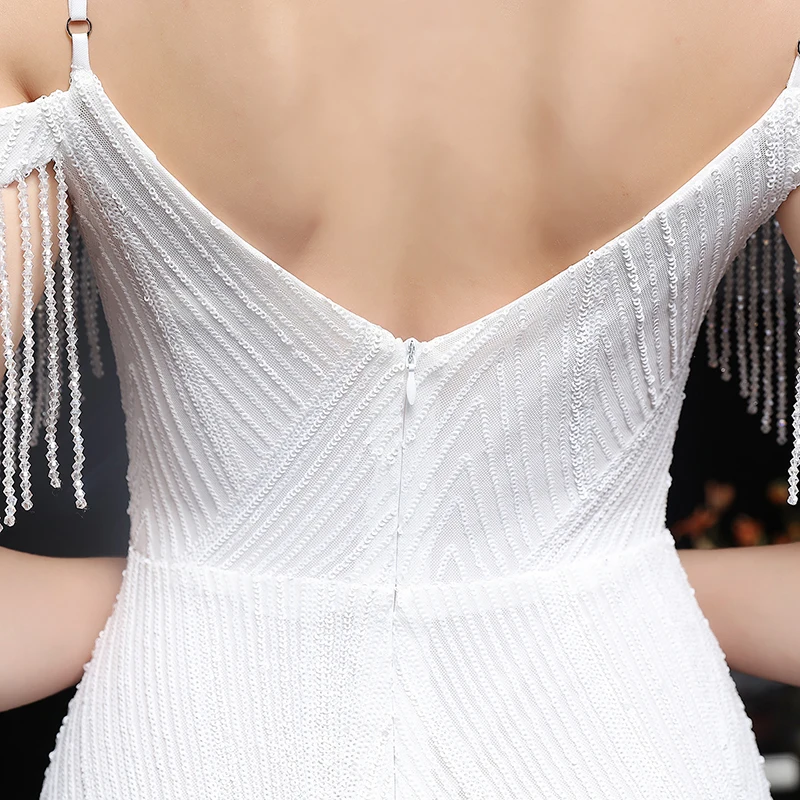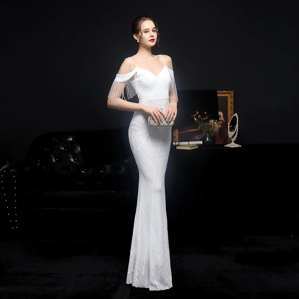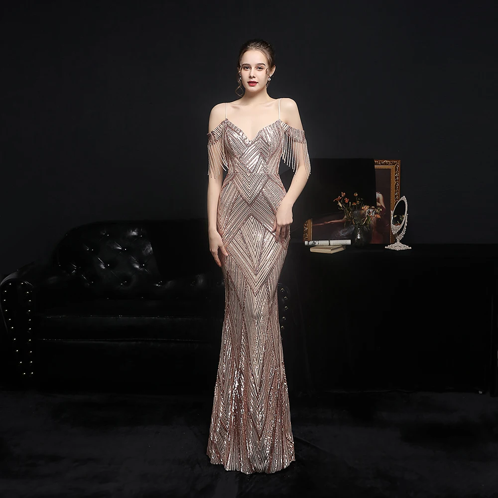 Fleepmart Women Elegant Off Shoulder Luxury Evening Dress Sexy Sequin Mermaid Dress Spaghetti Straps Silver Beading Long Party Dress New