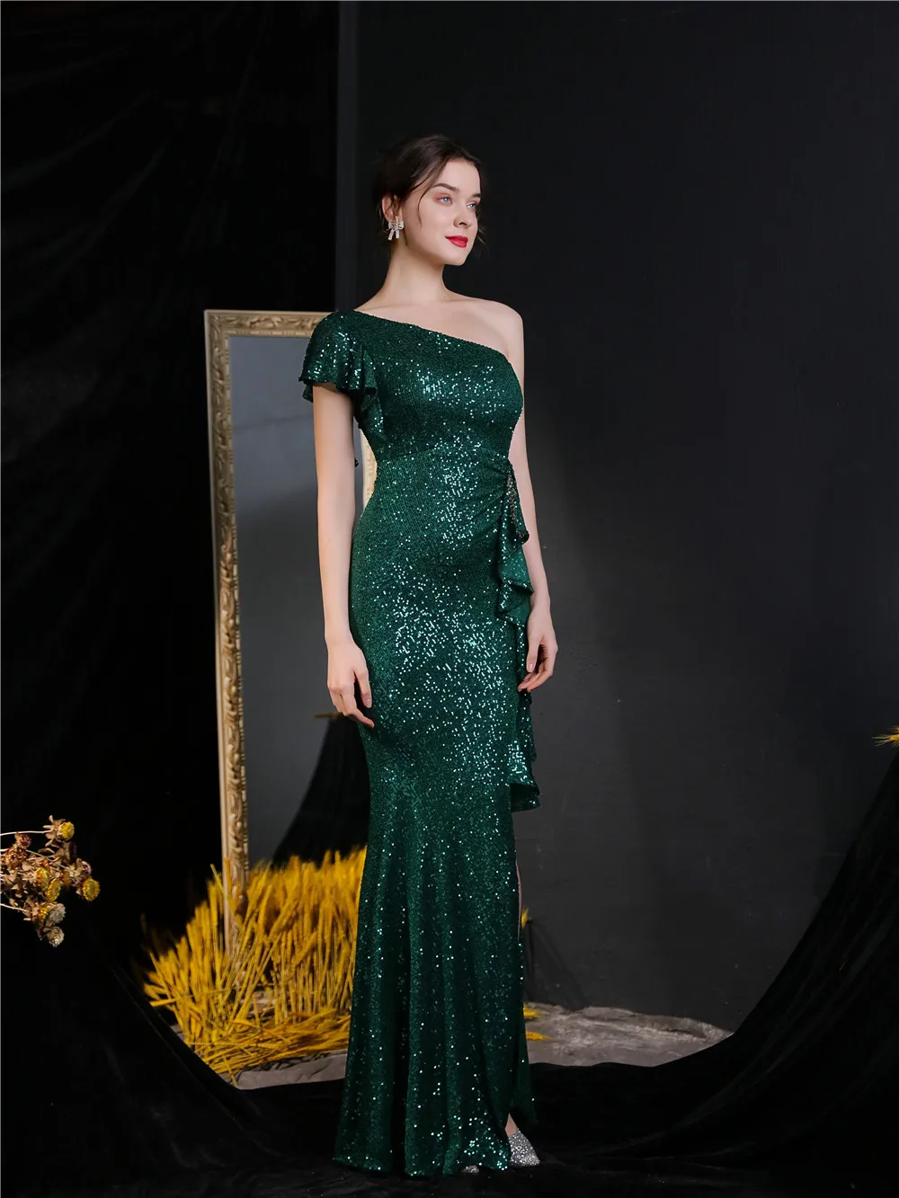 Fleepmart Women Elegant One Shoulder Ruffles Evening Dress Sexy Hight Slit Gold Sequin 2022 Women Party Maxi Dress Vestidos