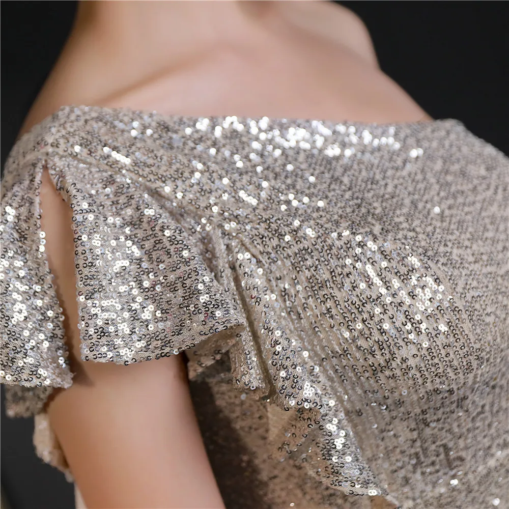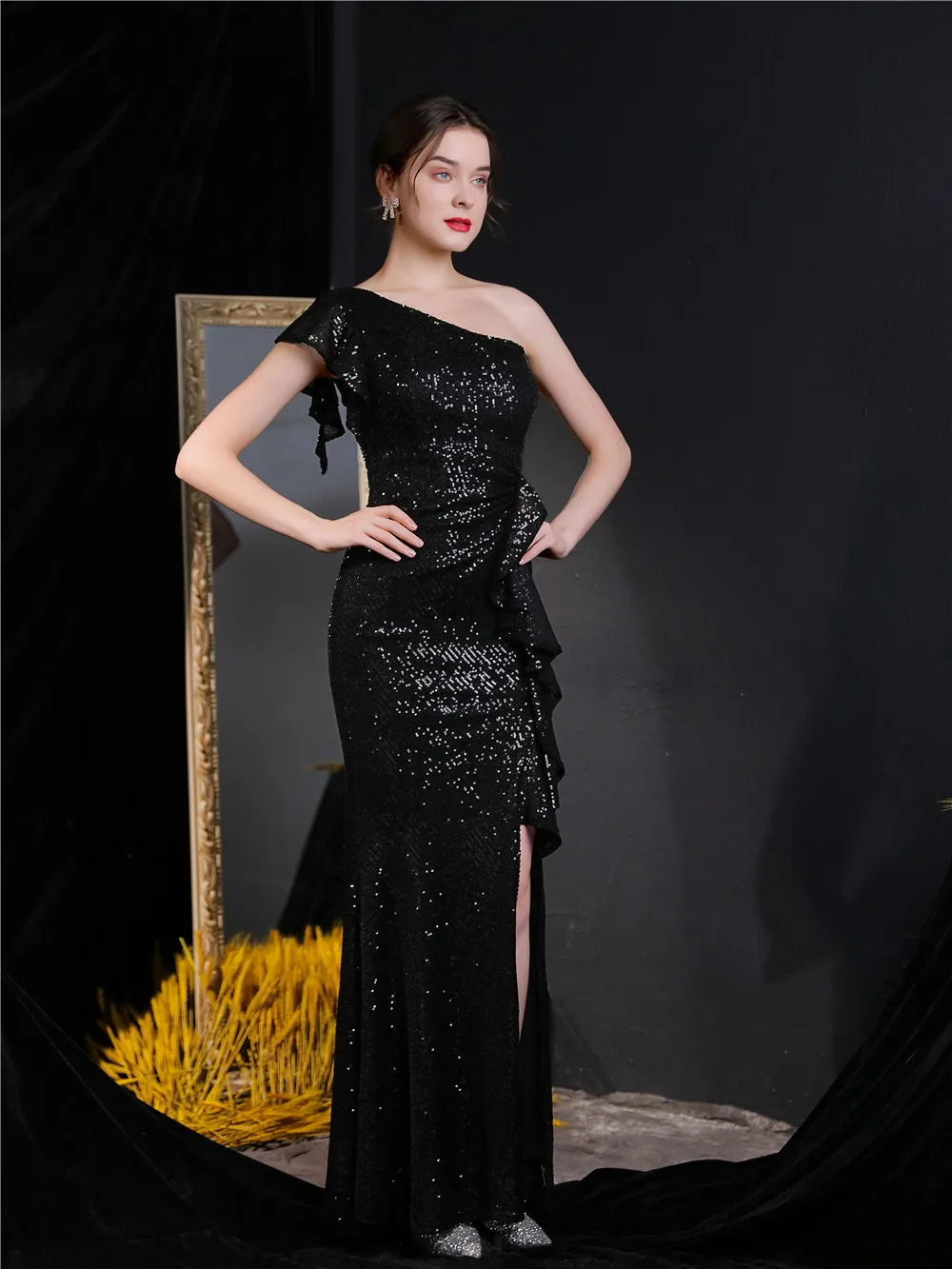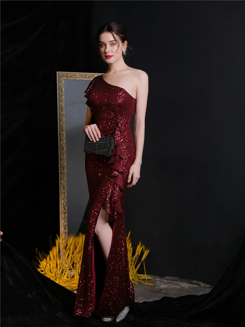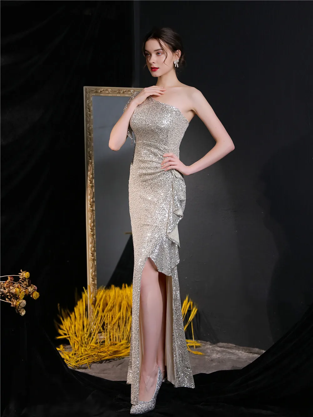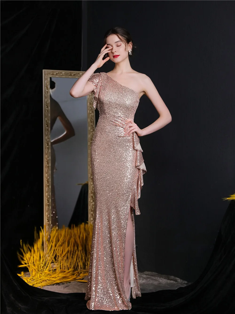Fleepmart Women Elegant One Shoulder Ruffles Evening Dress Sexy Hight Slit Gold Sequin 2022 Women Party Maxi Dress Vestidos