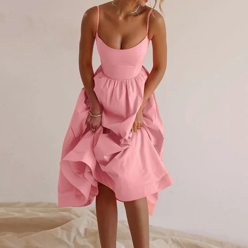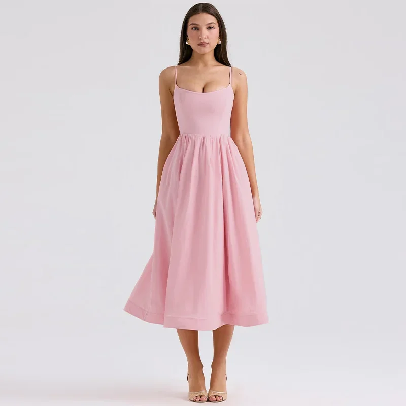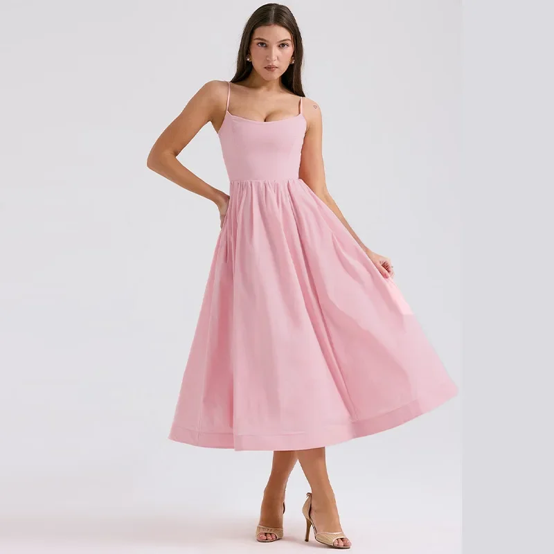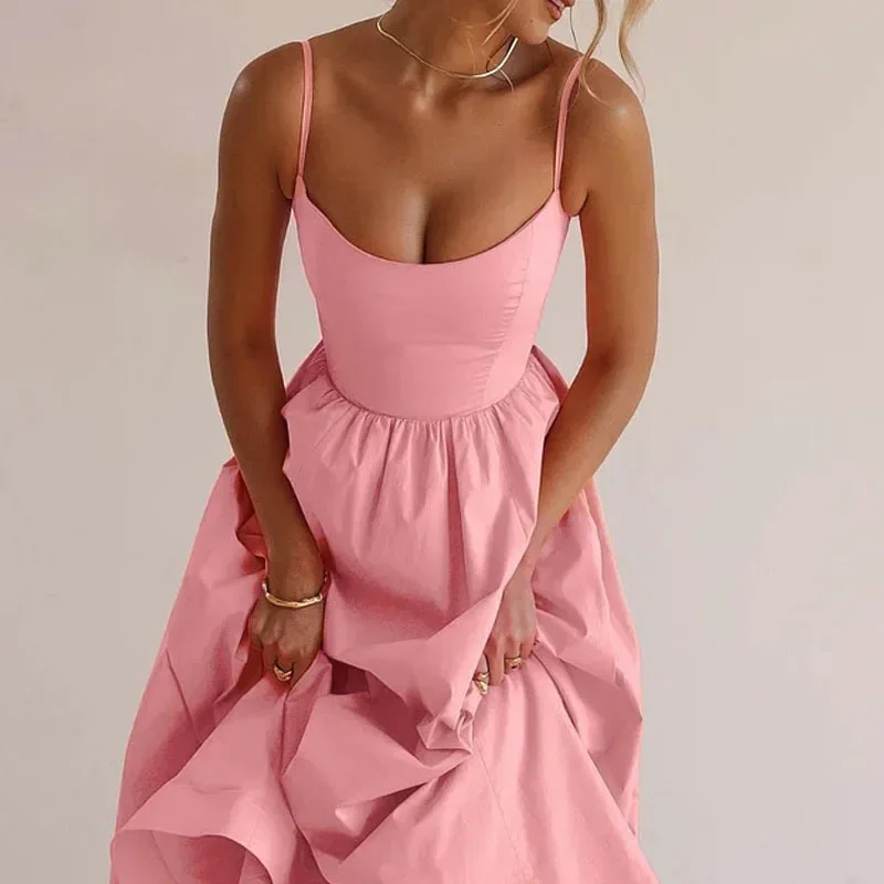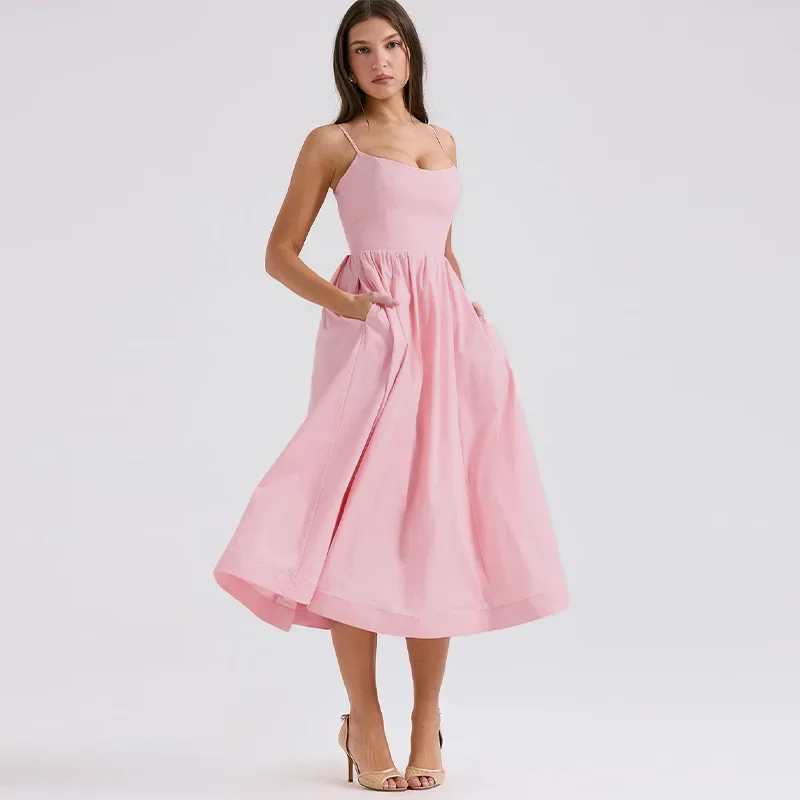 Fleepmart Women Elegant Solid Spaghetti Strap Midi Dress Fashion U-neck Sleeveless Backless Pocket Dresses Summer Lady Party A-line Robes
