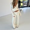 Fleepmart Women Fashion Lounge Set Vintage 2 Piece Outfit V Neck Waist Tie T-shirt + Elastic Waist Pants Autumn Long Sleeve Crop Tops