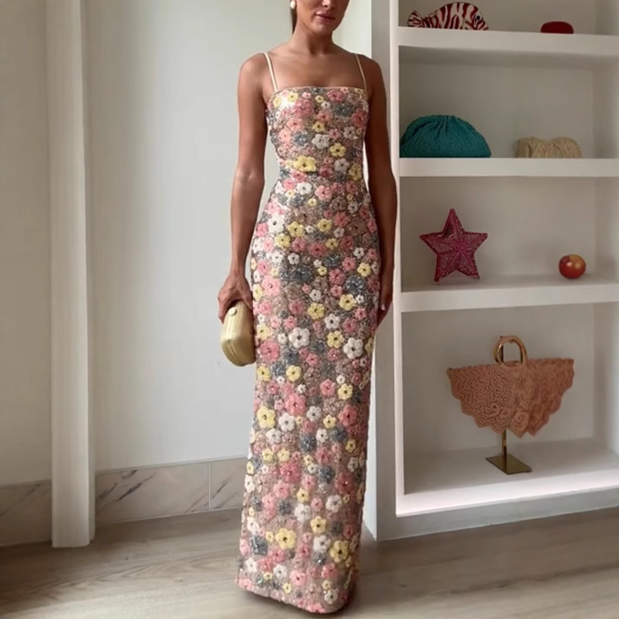 Fleepmart Women Flowers Sequin Patchwork Slim Party Long Dress Strapless Fashion Maxi Dress, Sexy Sleeveless Ladies Dress Vestidos