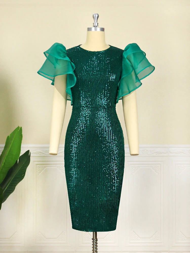 Fleepmart Women Green Dress Sequin Bodycon Party Sheath Sexy Ruffle Sleeve Spring Summer Birthday Celebrity Gowns African Big Size 3XL 4XL