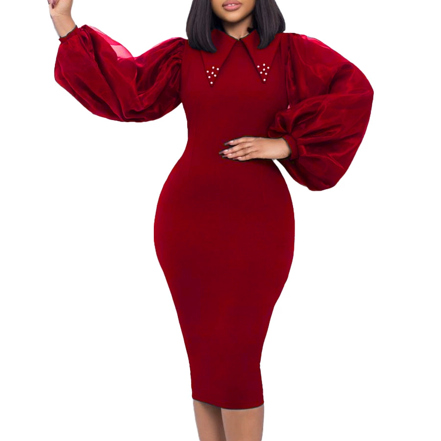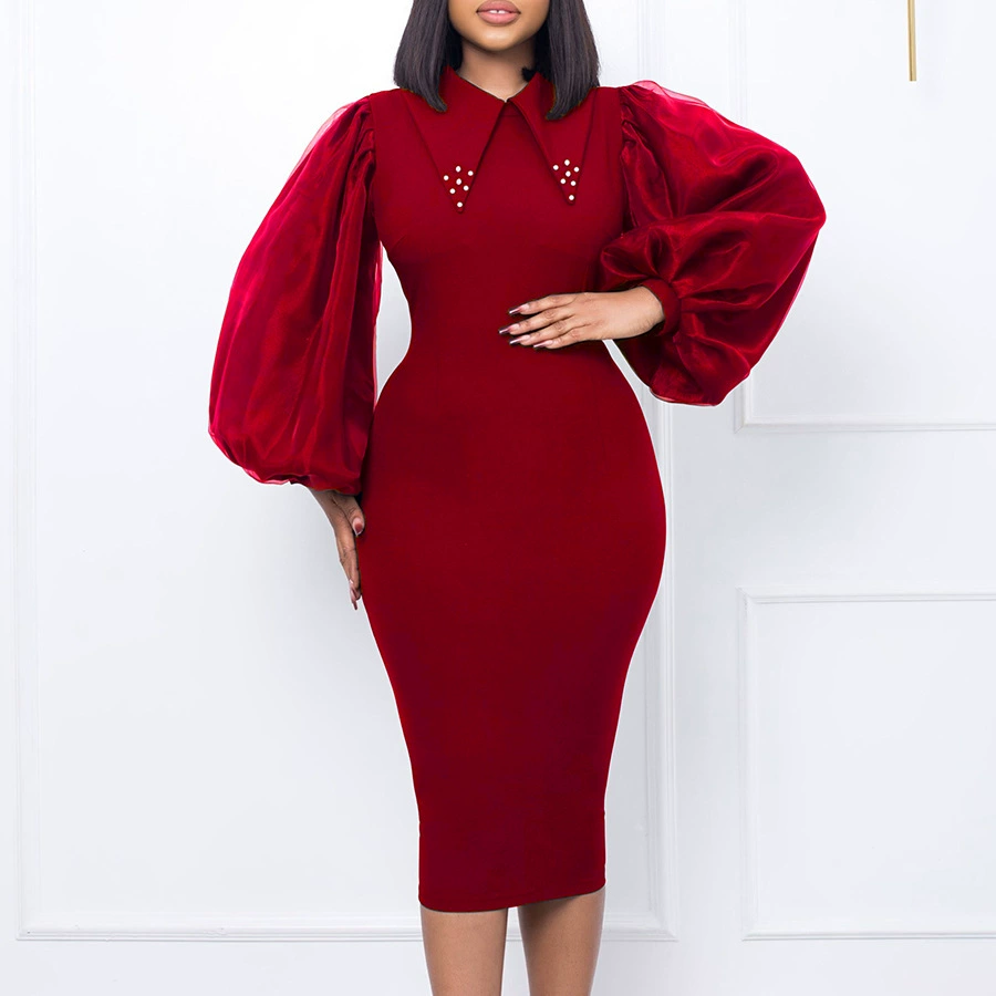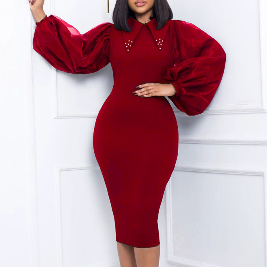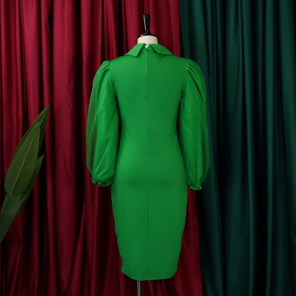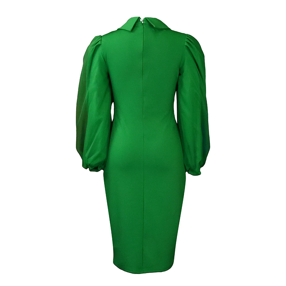 Fleepmart Women Long Lantern Sleeves Dress Turn Down Collar Autumn Fashion Bodycon Sheath Female Robes Elegant Office Ladies Date Out New