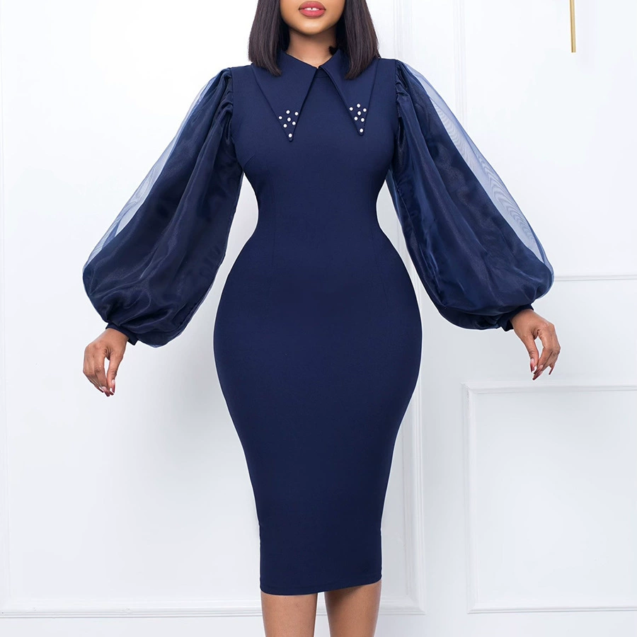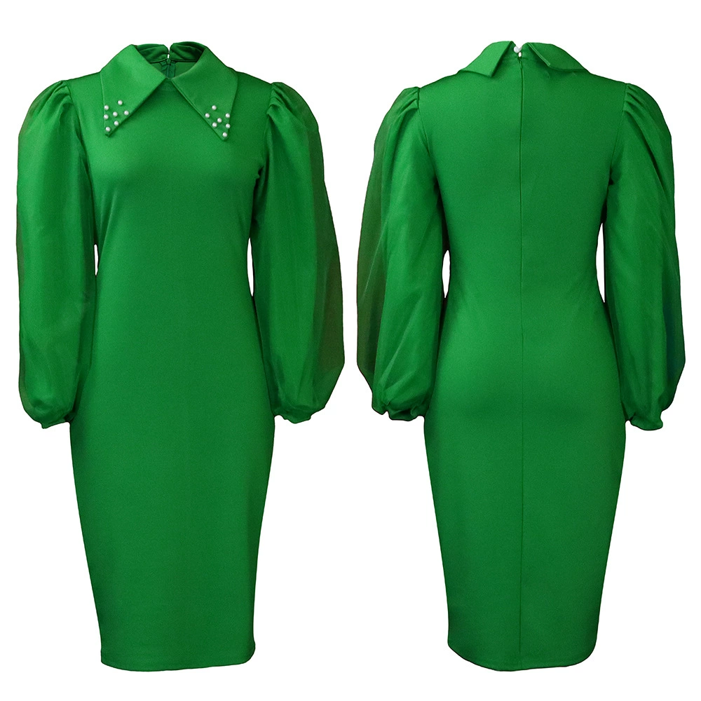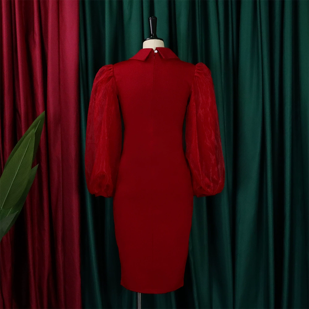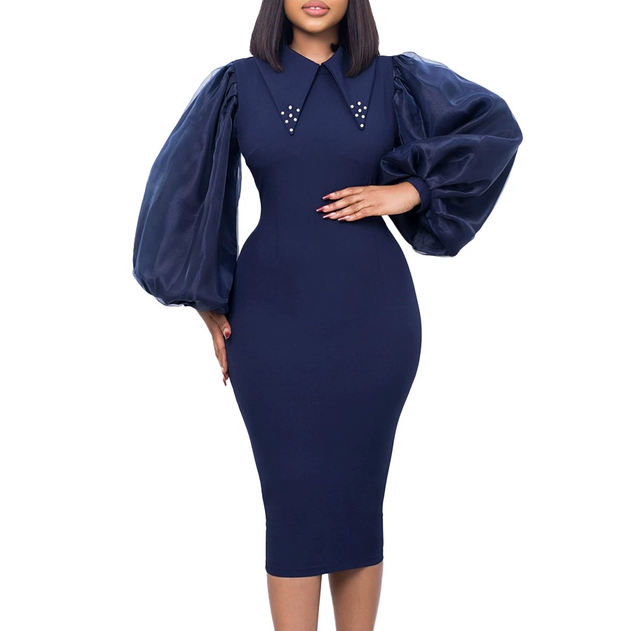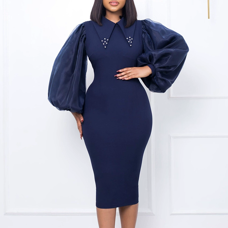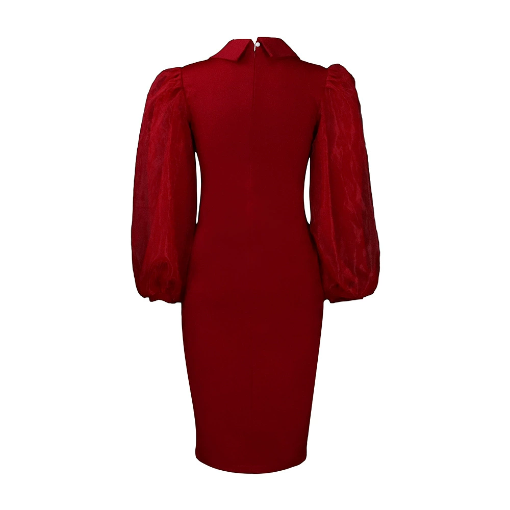 Fleepmart Women Long Lantern Sleeves Dress Turn Down Collar Autumn Fashion Bodycon Sheath Female Robes Elegant Office Ladies Date Out New