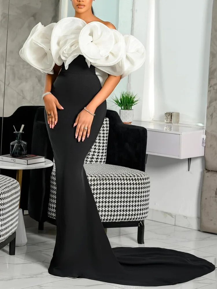 Fleepmart Women Long Party Dress Off Shoulder Ruffle White Black Contrast Color Maxi African Female Event Prom Evening Celebrate Night Out
