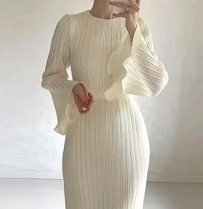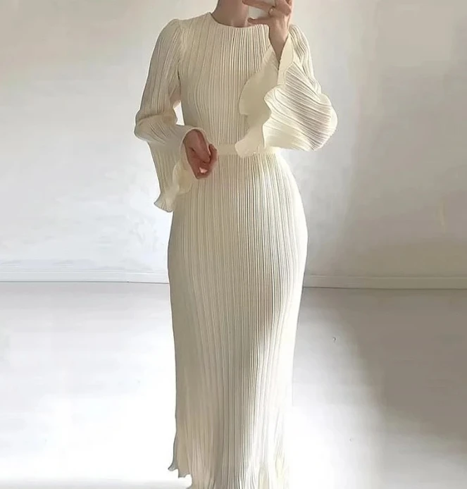 Fleepmart Women Maxi Dress 2025 Spring Round Neck Flare Long Sleeved Pleated Slim Casual Dresses for Women Office Streetwear