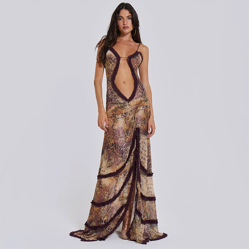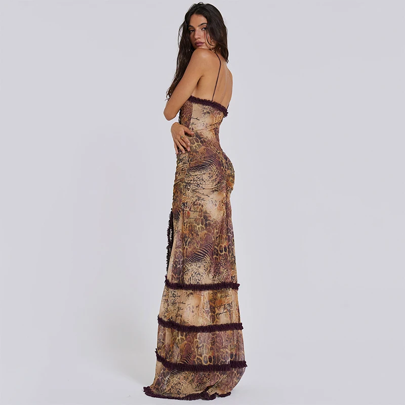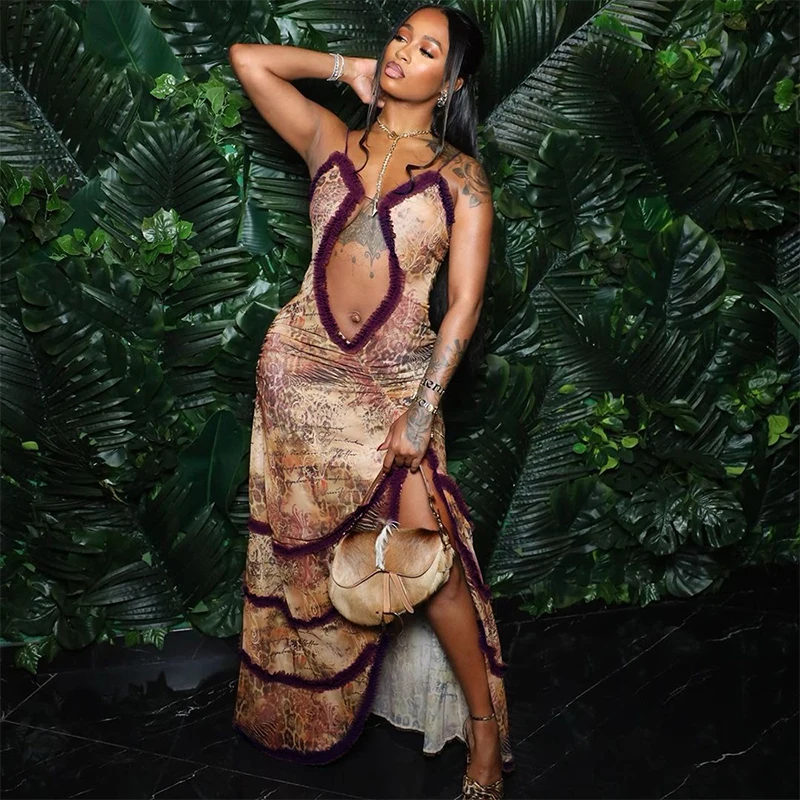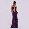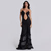 Fleepmart Women Noble Furry Halter Sleeveless Hollow Dress Camisole Shrunk Split Wave Cut Dress Luxury Prom Occasion Evening Gown
