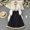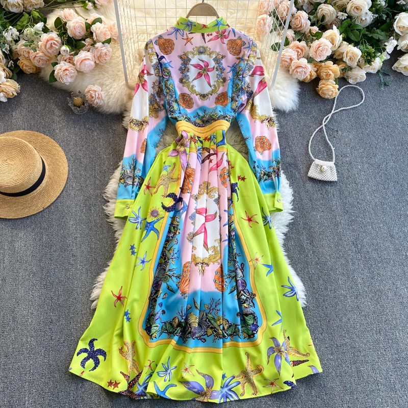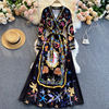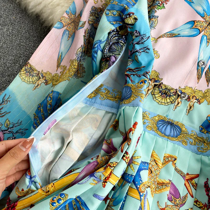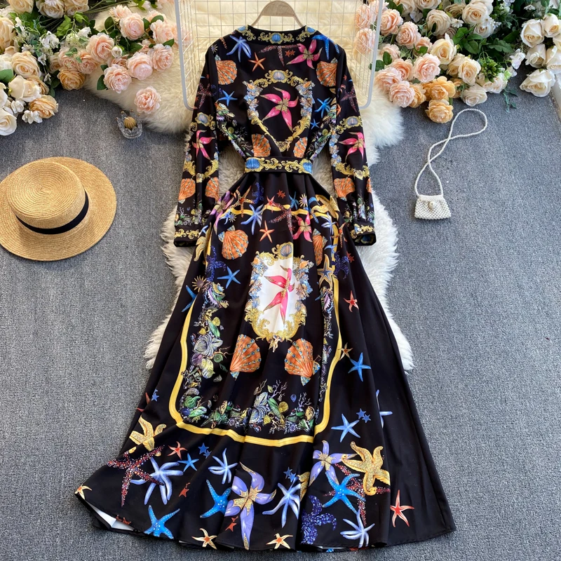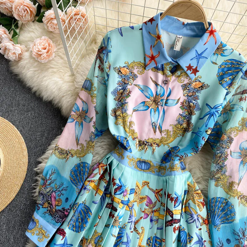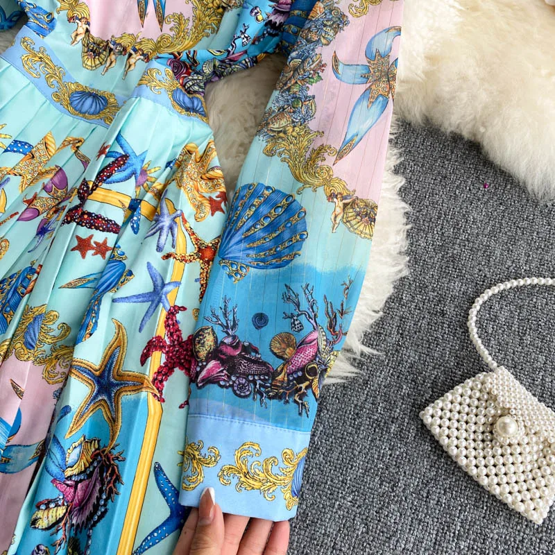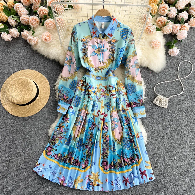 Fleepmart Women Palace Style Sense Niche Print Dress Long Sleeve Pleated Dresses Evening Party Banquet Dresses
