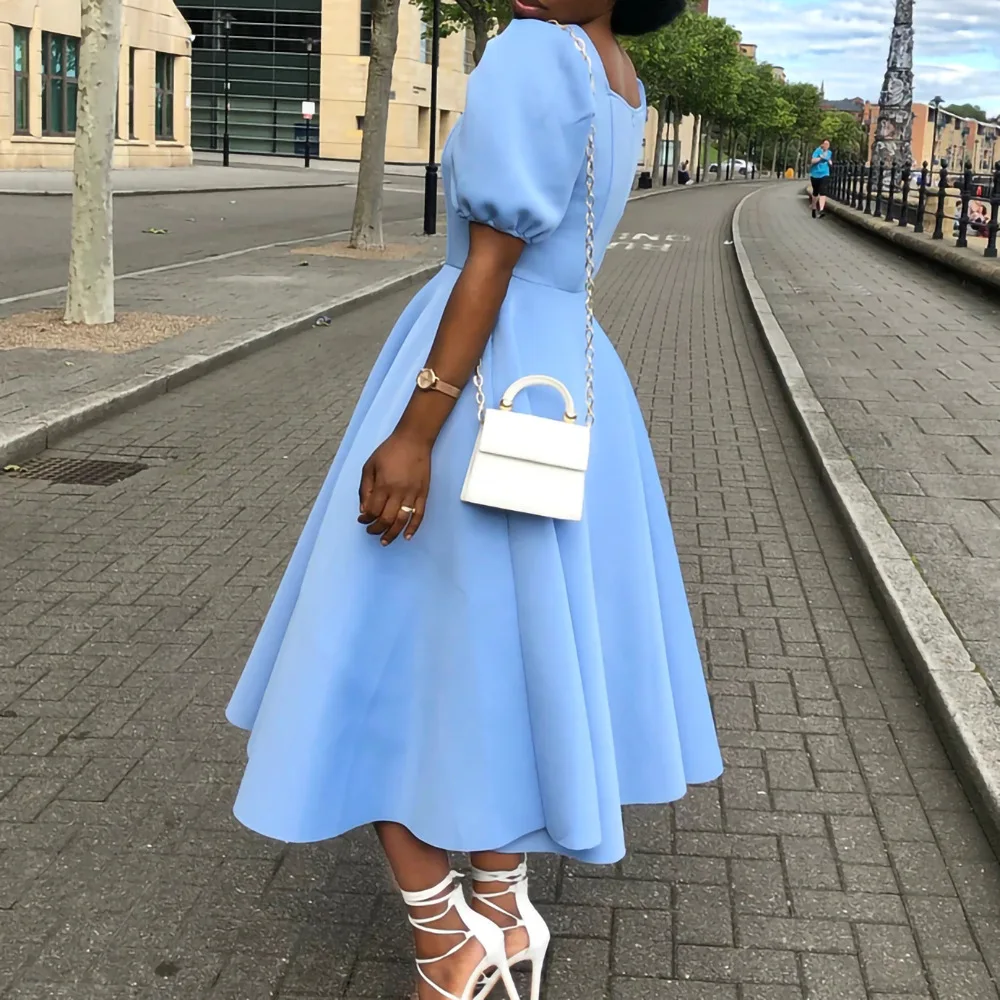 Fleepmart Women Party Dress Square Collar Short Lantern Sleeves Pleated High Waist Female African Female Birthday Event Occasion Robes New