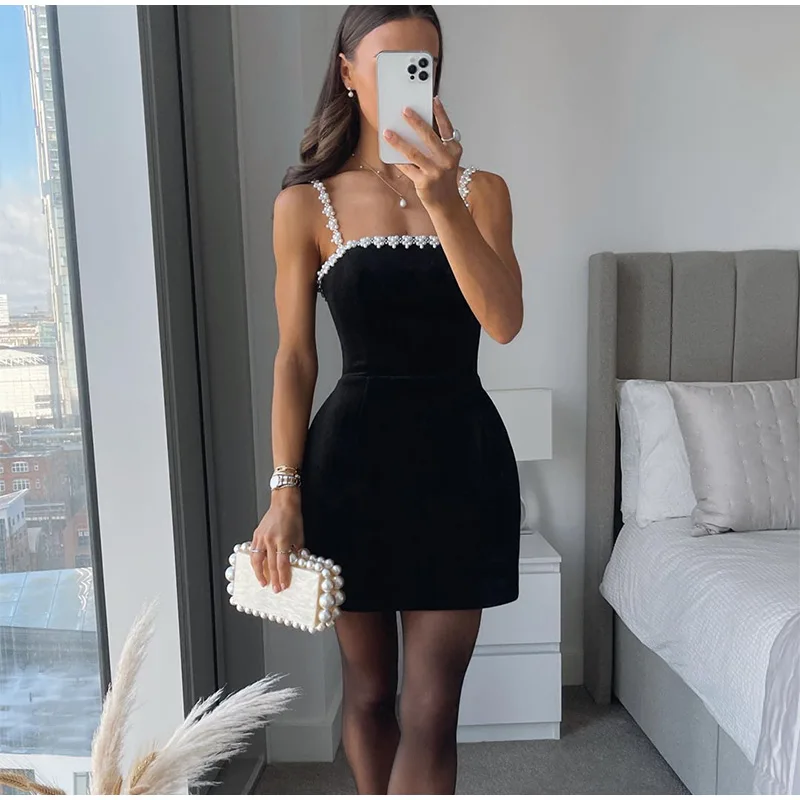 Fleepmart Women Rhinestone Velvet Mini Elegant Sleeveless High Waist A-line Sling Dress Evening Party Gown Robes