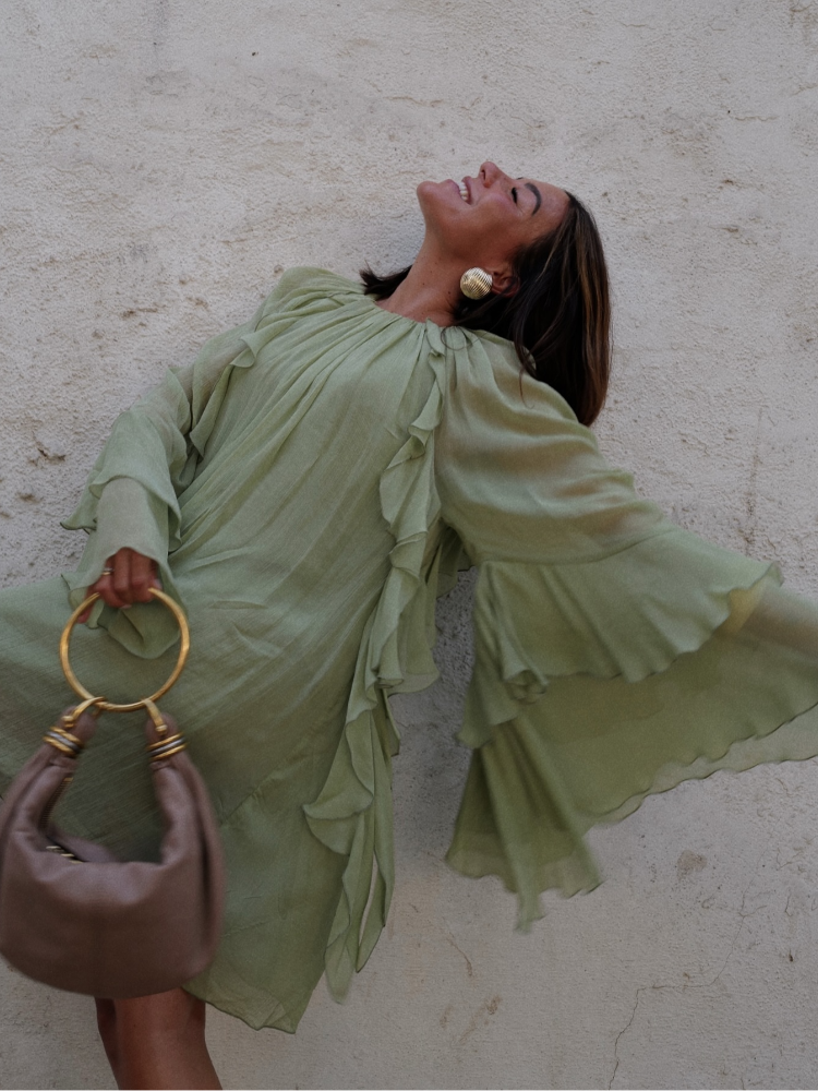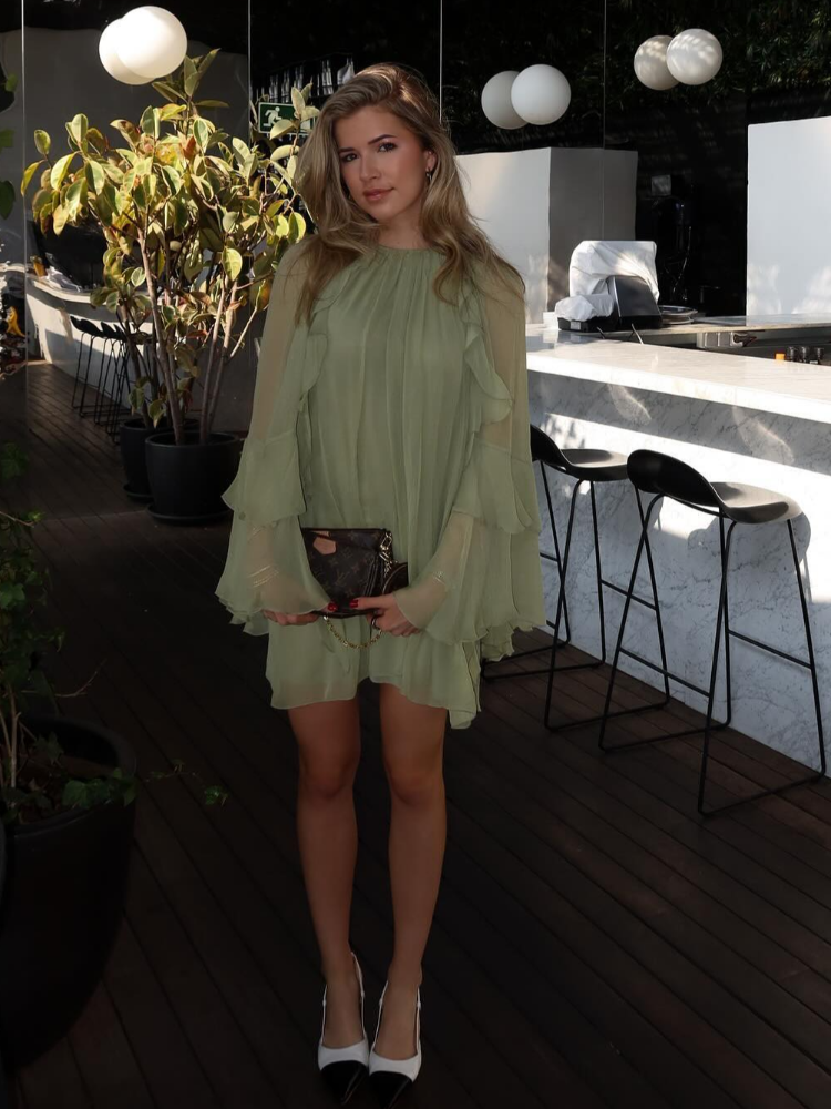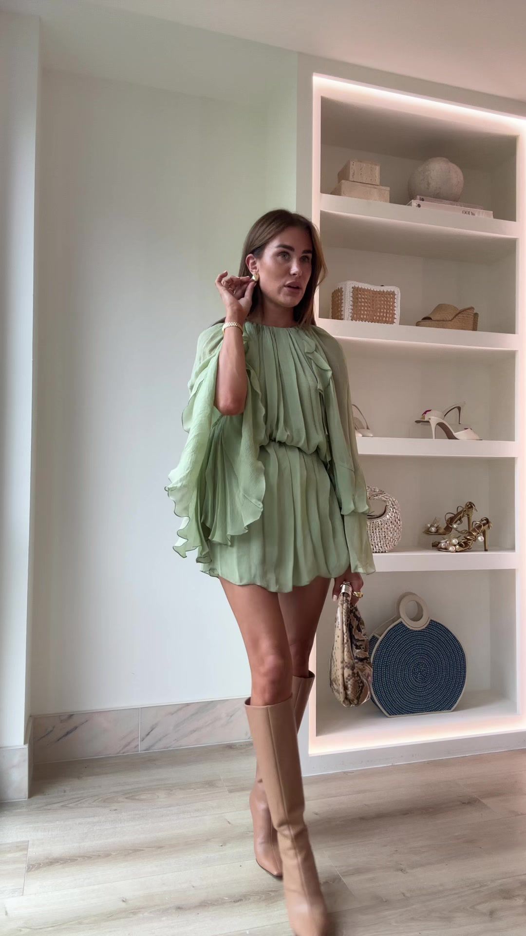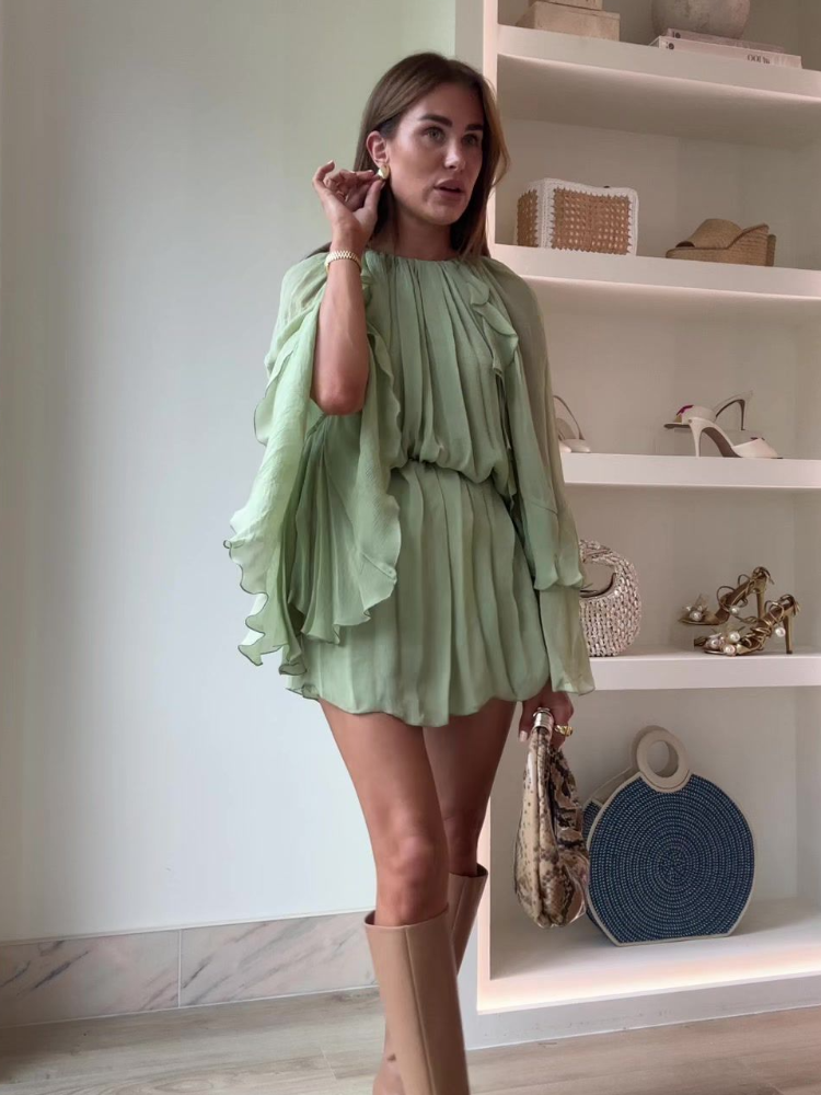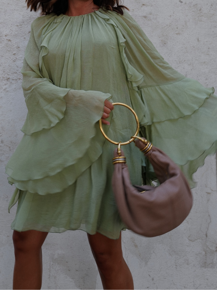 Fleepmart Women Ruffle Hem Mini Dress Elegant Round Neck Long Flare Sleeve Party Summer New Lady Vacation Dress