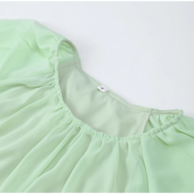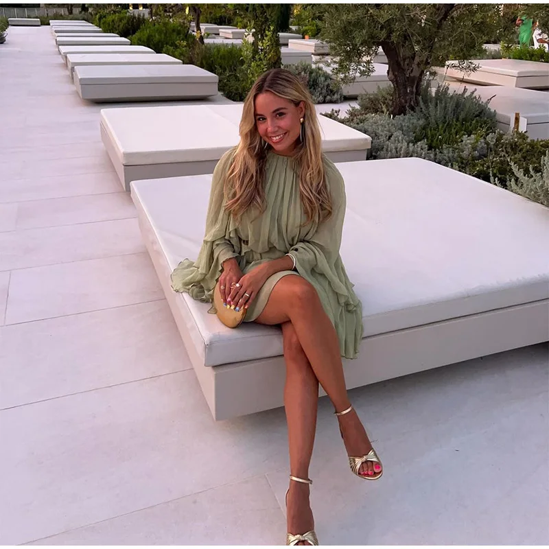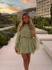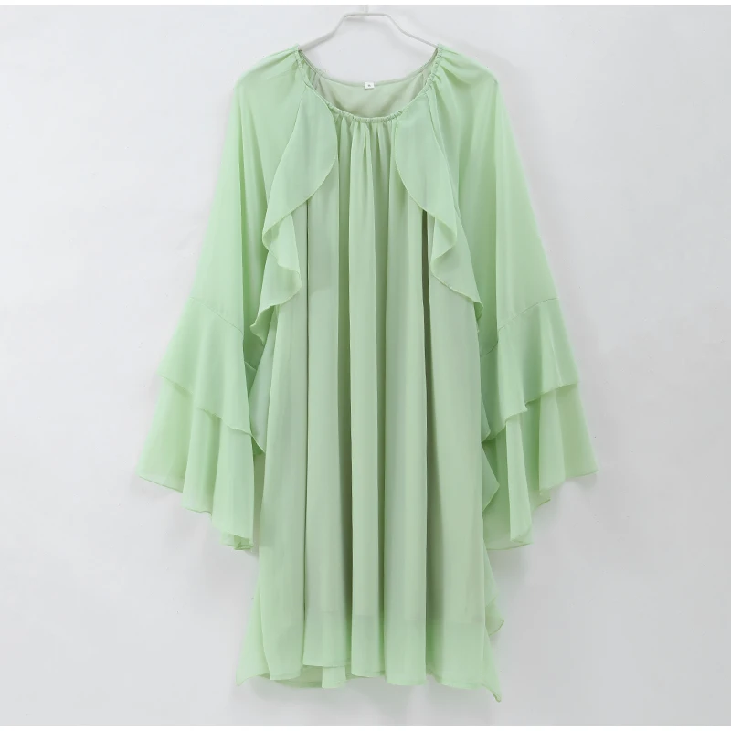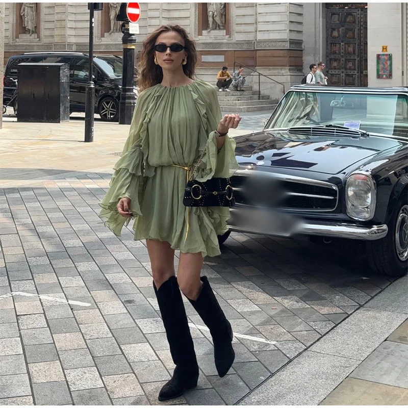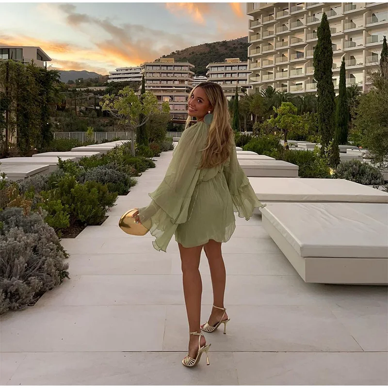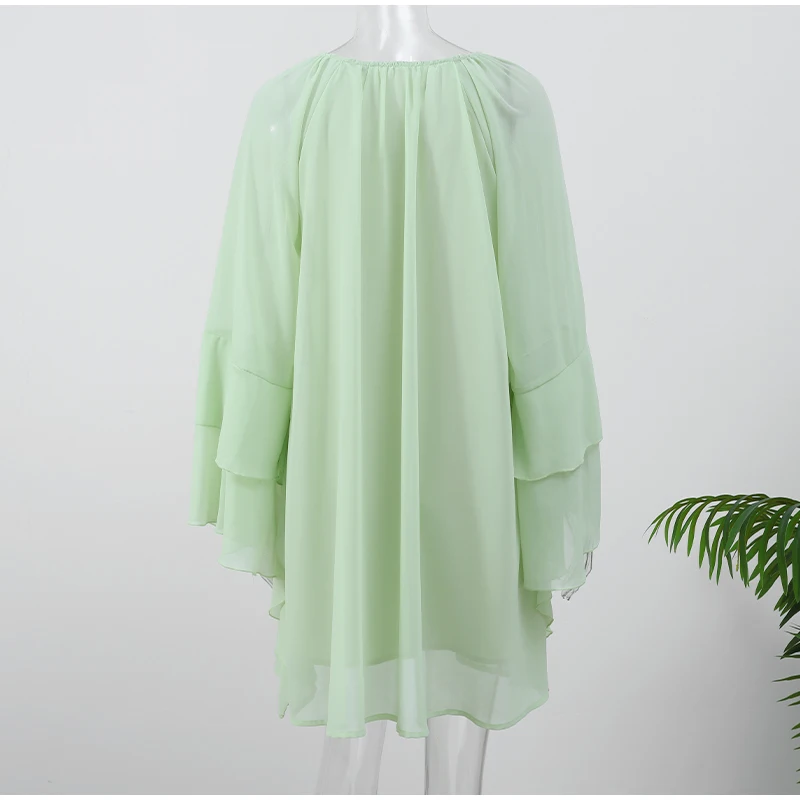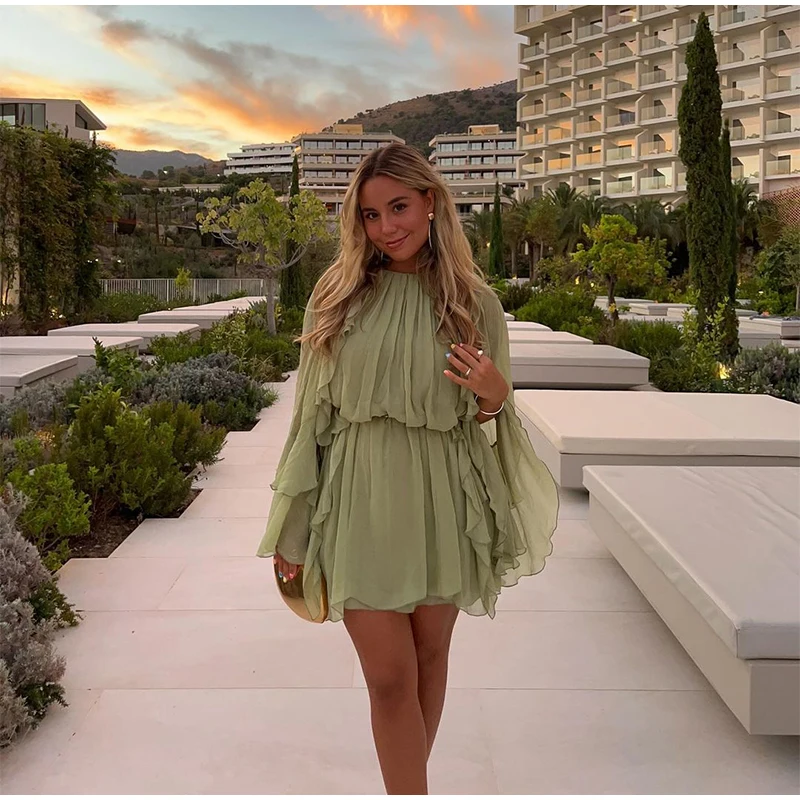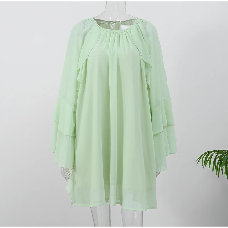 Fleepmart Women Ruffle Hem Mini Dress Elegant Round Neck Long Flare Sleeve Party Summer New Lady Vacation Dress
