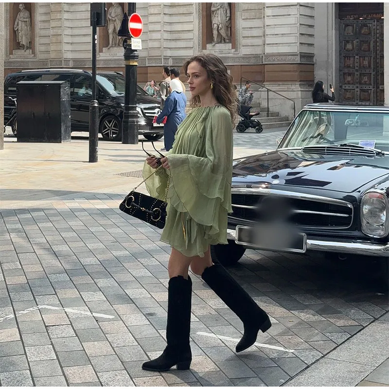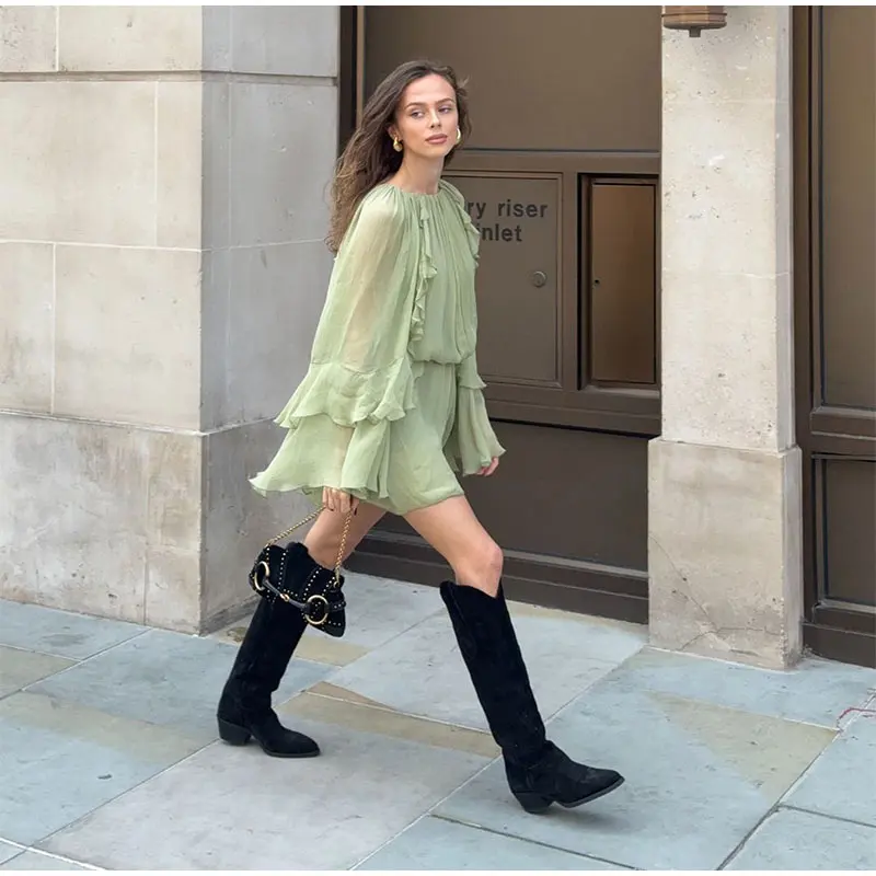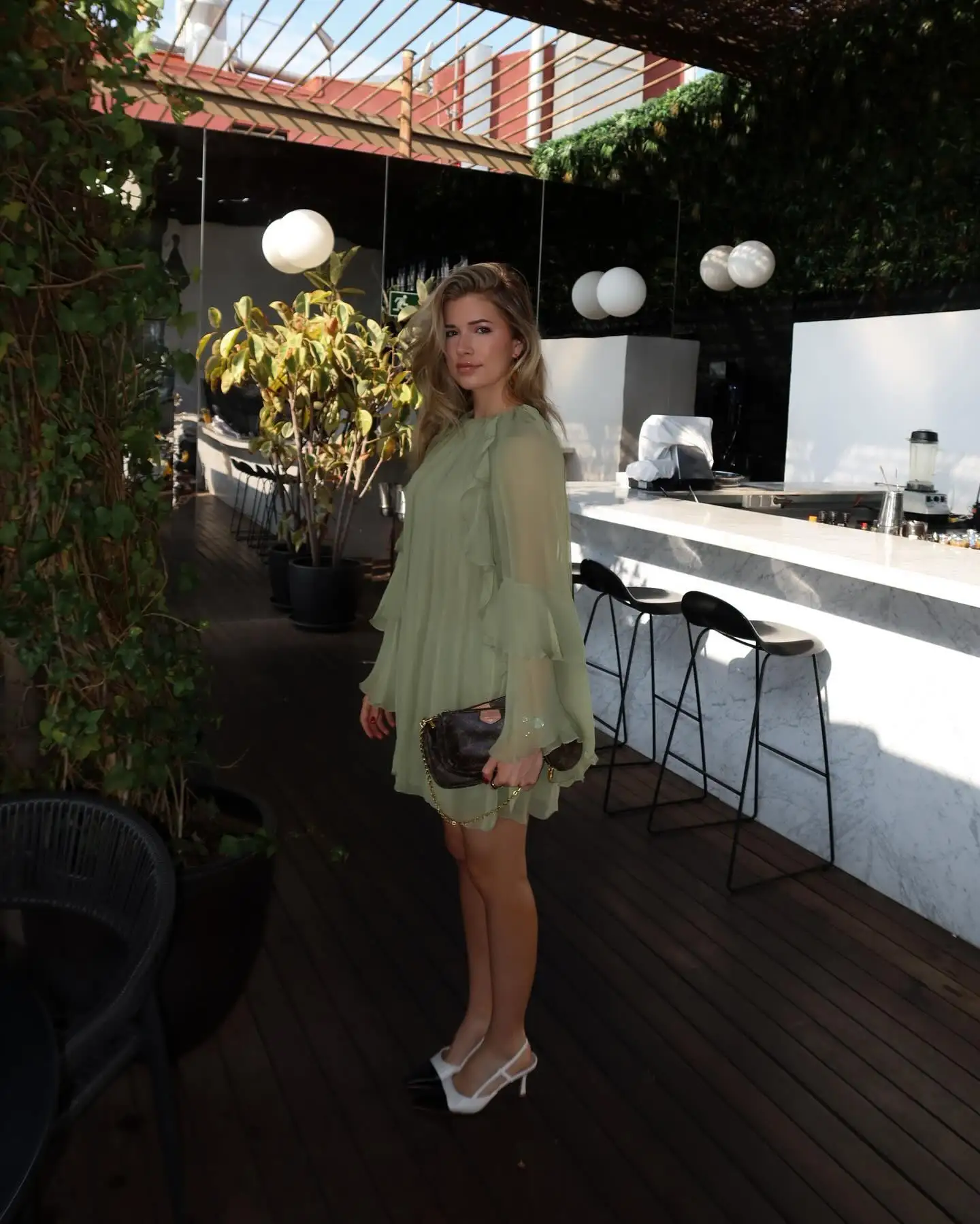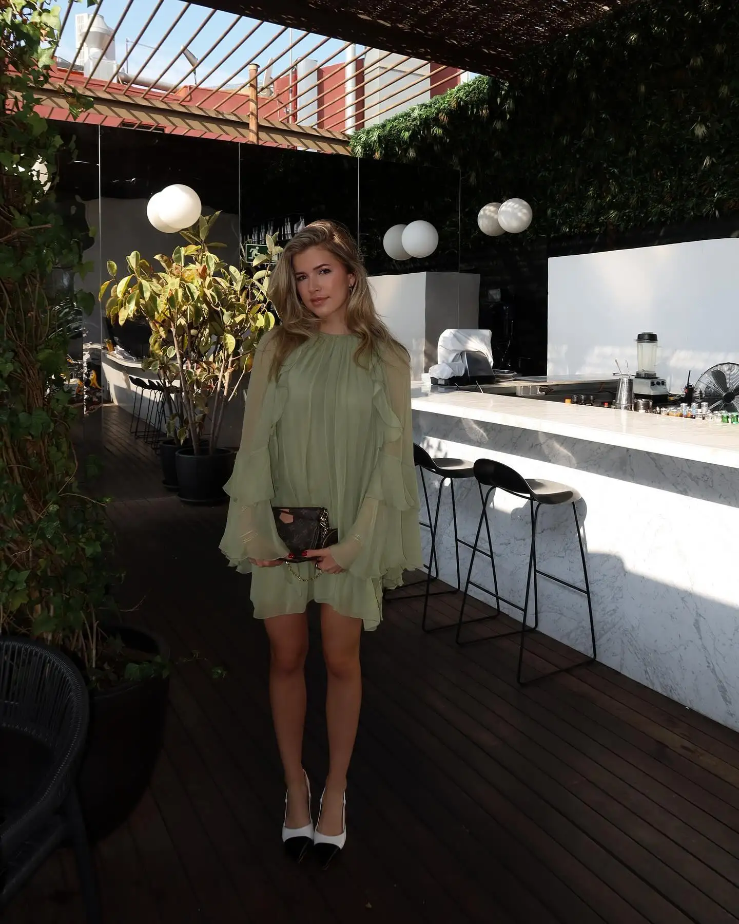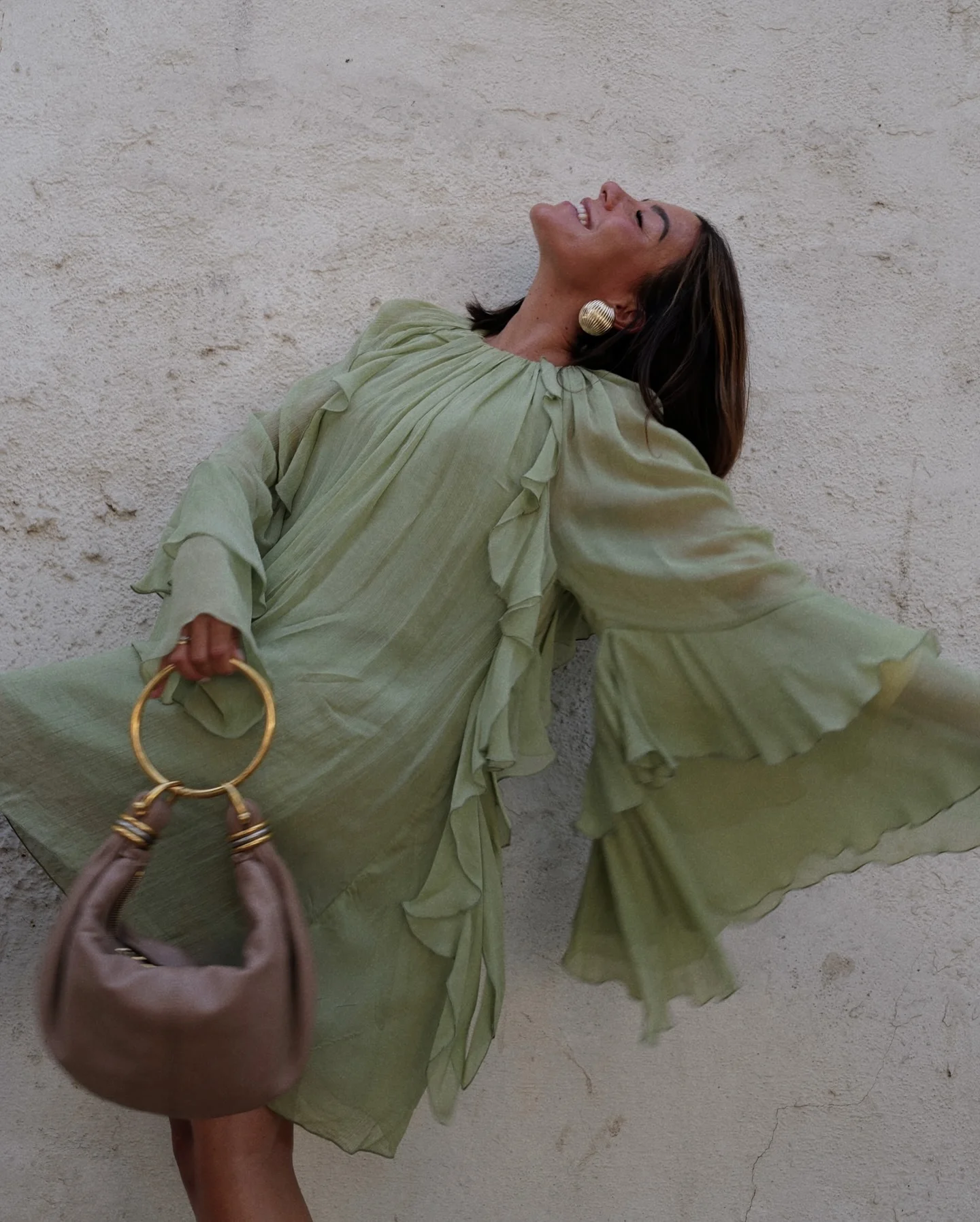 Fleepmart Women Ruffle Hem Mini Dress Elegant Round Neck Long Flare Sleeve Party Summer New Lady Vacation Dress